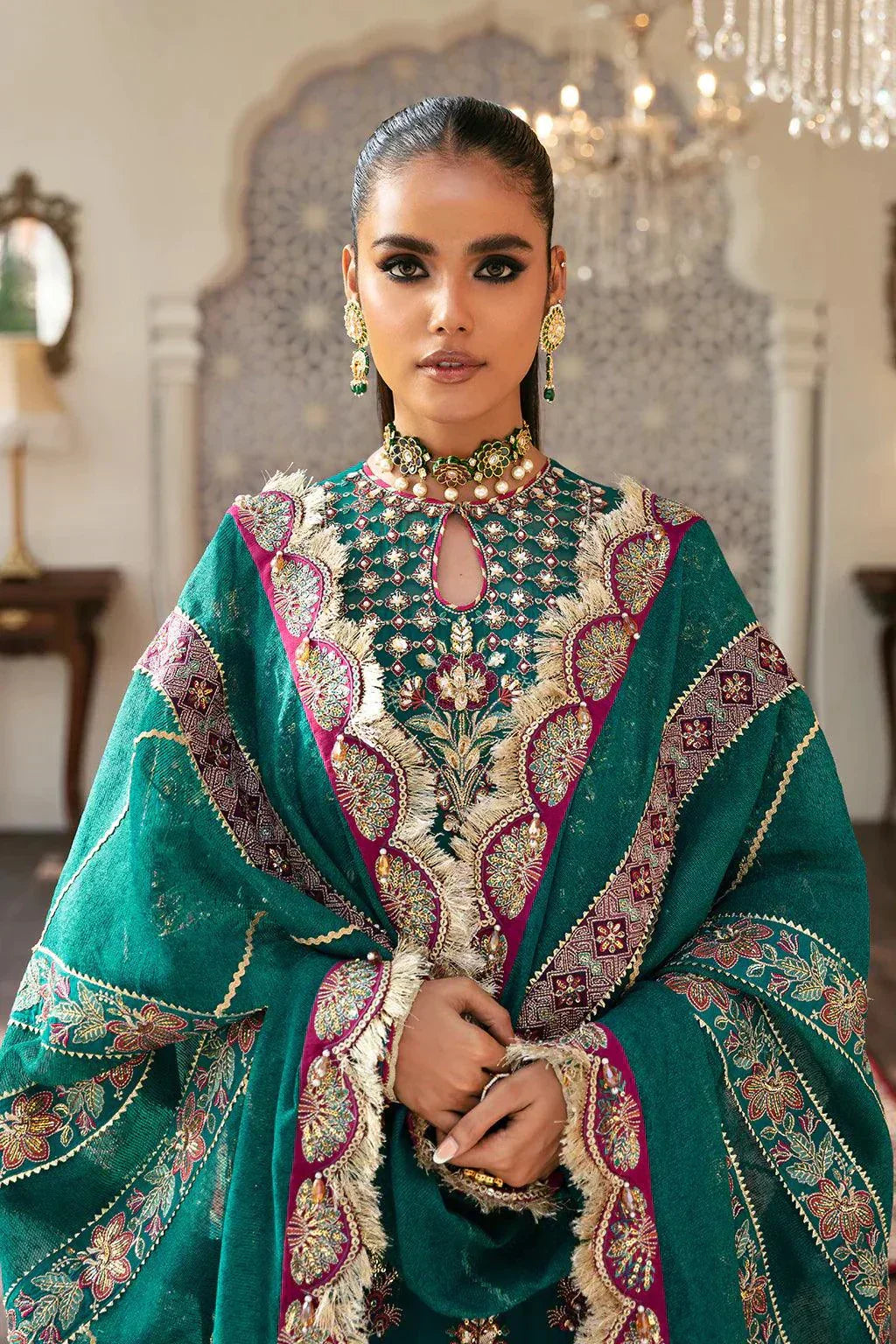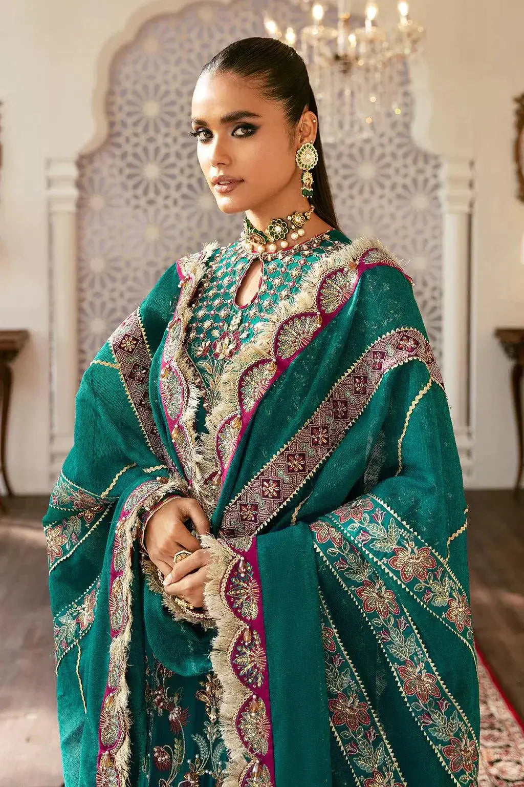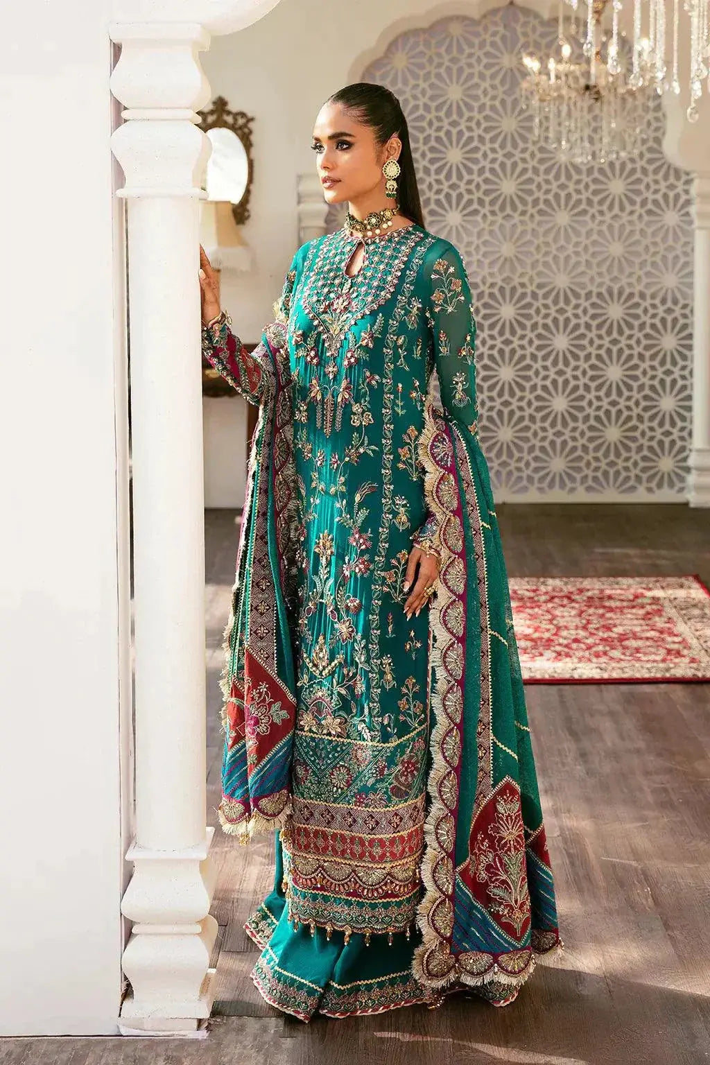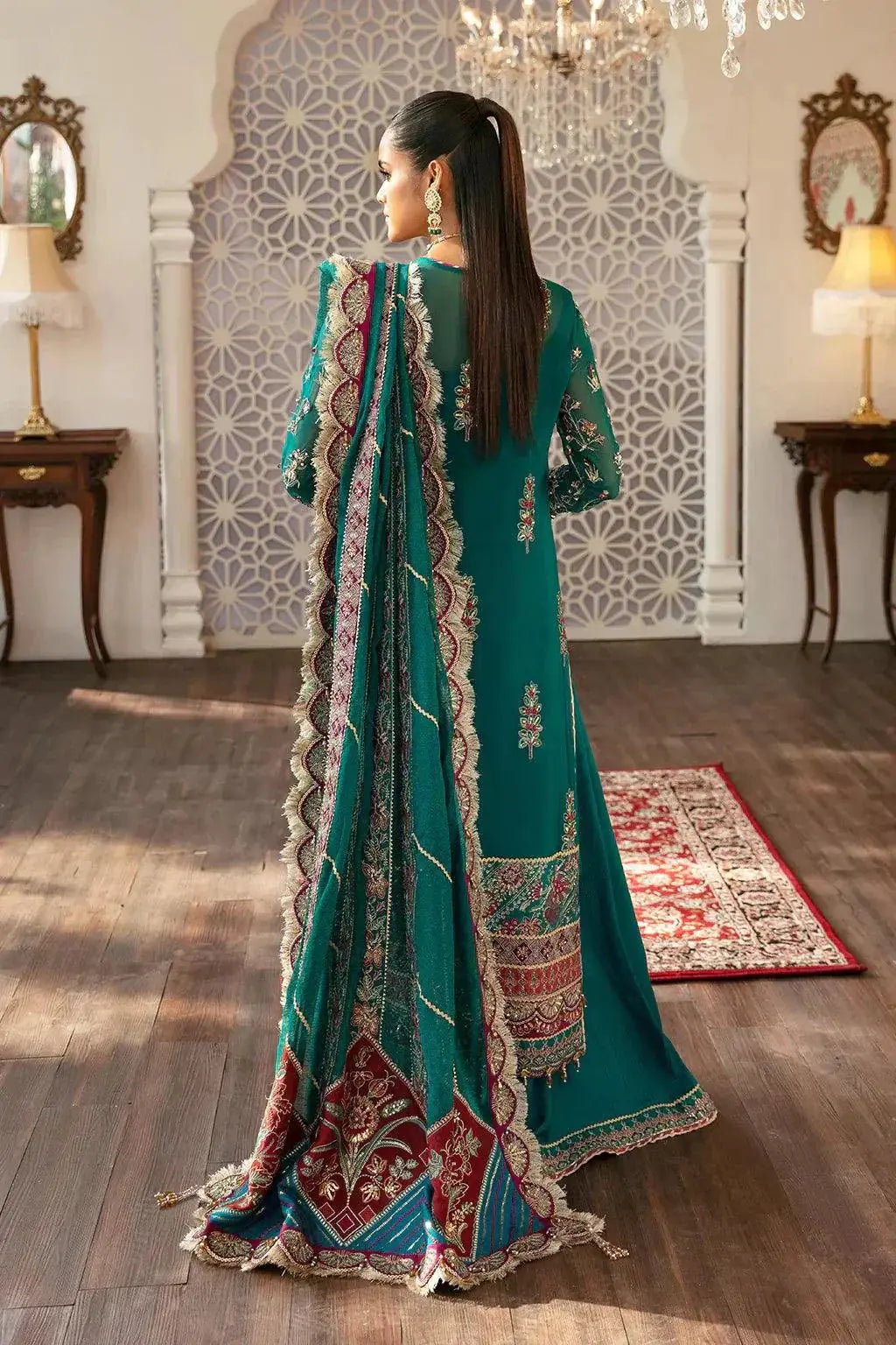 This luxurious chiffon ensemble features an intricately embroidered front with center, right, and left panels, and a 0.98-meter embroidered back. Enhanced with multiple viscose embroidered front and back borders (A–F) and detailed sleeve embroidery with layered borders (A–C), it exudes sophistication. The 2.62-meter cotton net dupatta is finished with a 9-meter four-side border and additional 1.97-meter pallu borders (A & B). Paired with a 2.28-meter raw silk dyed trouser with a 2.28-meter embroidered trouser border, this outfit offers a regal and refined look perfect for wedding celebrations.