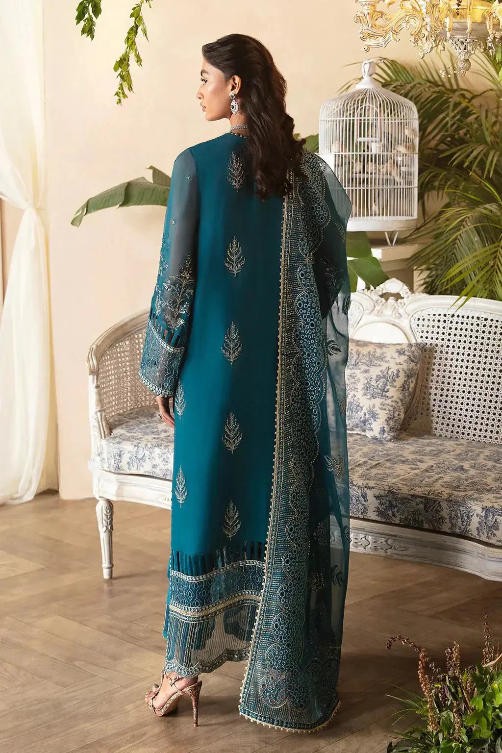 This elegant chiffon suit features a beautifully embroidered front and a 0.97-meter embroidered back, enhanced with two organza embroidered borders (1.95 meters each) for the front and back. It includes 0.65-meter embroidered sleeves with a 0.97-meter organza border. The 2.60-meter organza embroidered dupatta is finished with a 2.25-meter pallu border. A 2.25-meter raw silk dyed trouser completes this graceful and refined ensemble.