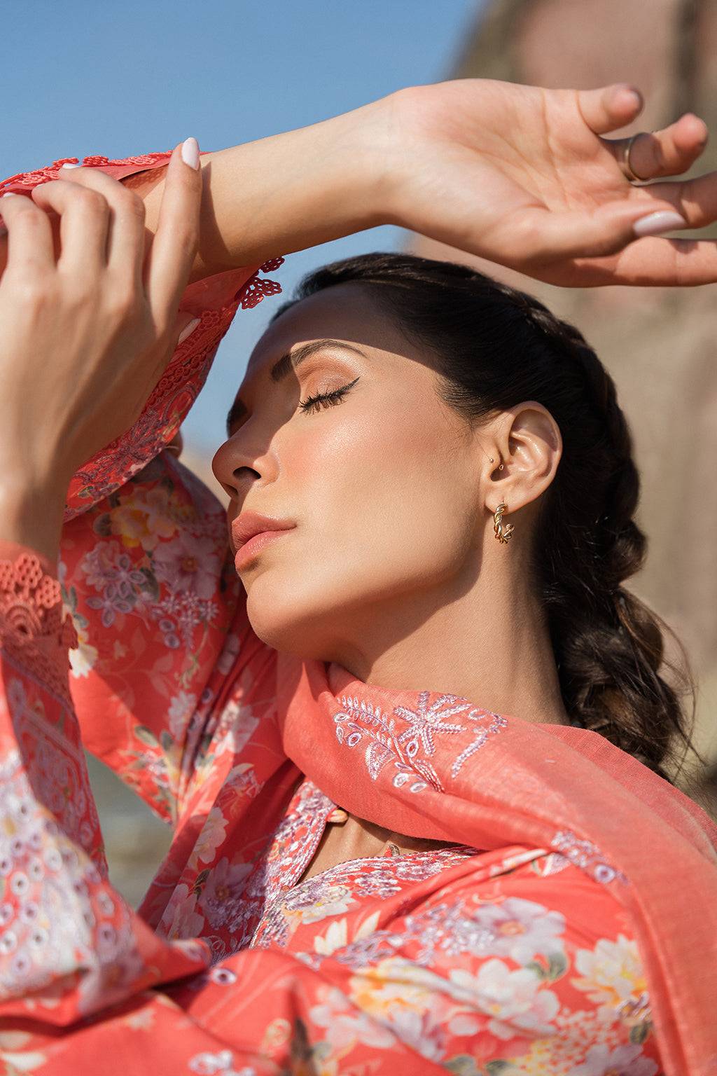 Work: Embroidered digital printed lawn front and sleeves with borders; digital printed lawn back; organza embroidered front, back, and dupatta pallu borders; slub cotton embroidered dupatta; digital printed cotton trouser.