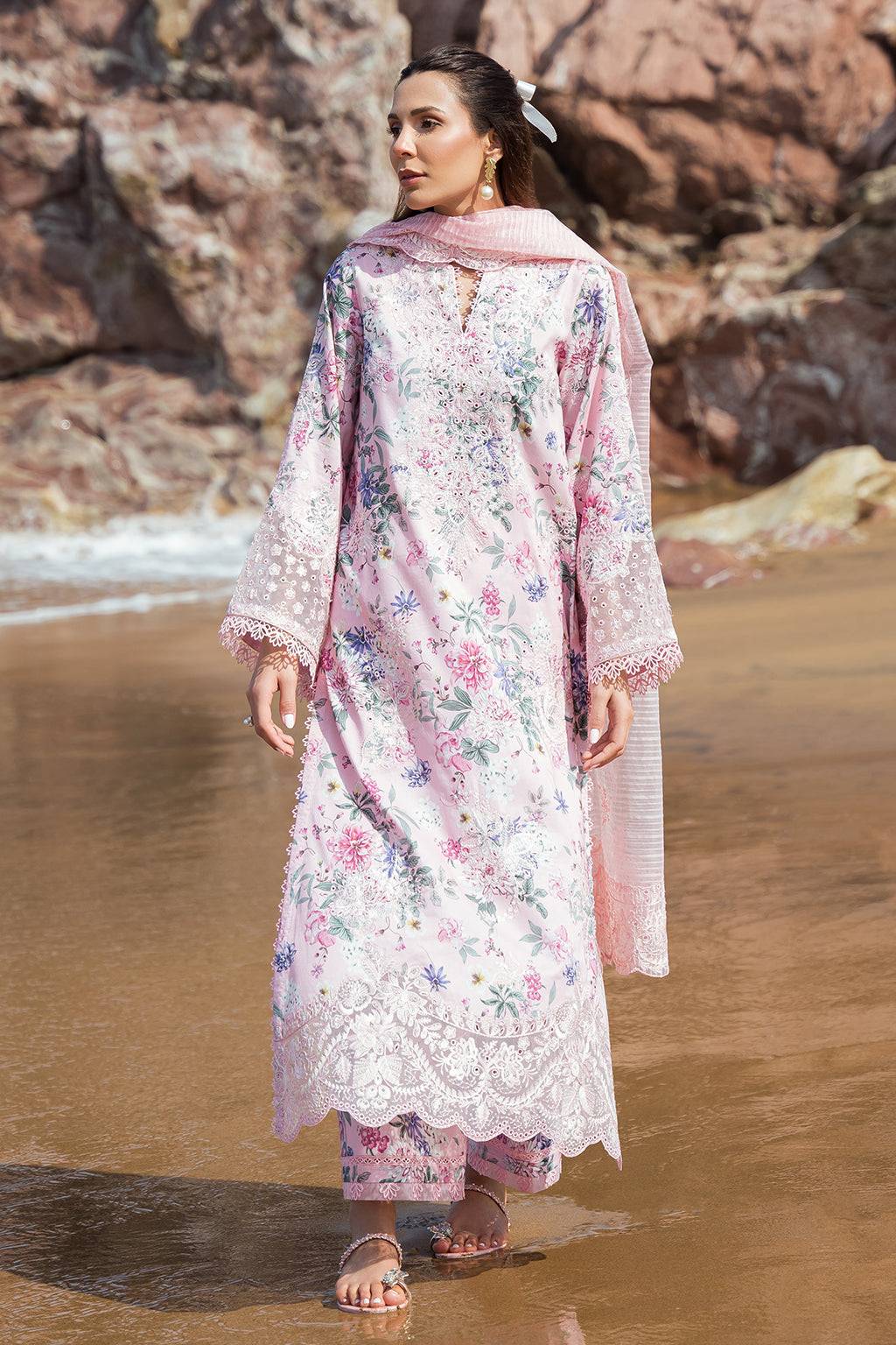 Work: Embroidered digital printed lawn front and sleeves with organza borders; digital printed lawn back; organza embroidered front, back, and sleeves borders; slub cotton embroidered dupatta with pallu border; digital printed cotton trouser.