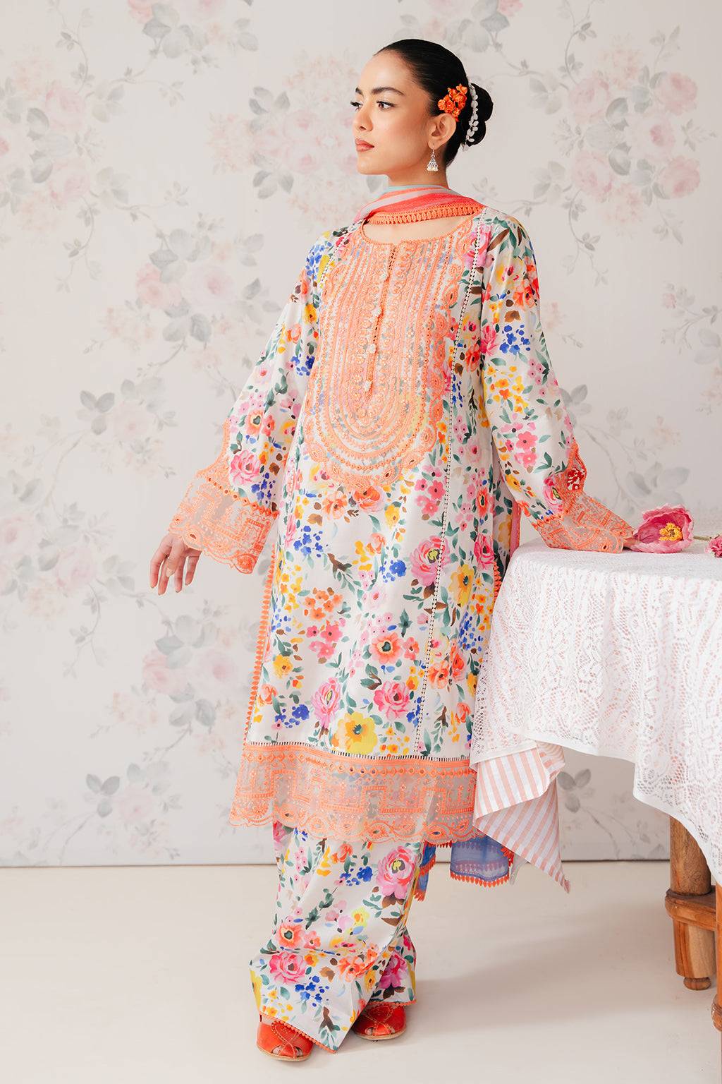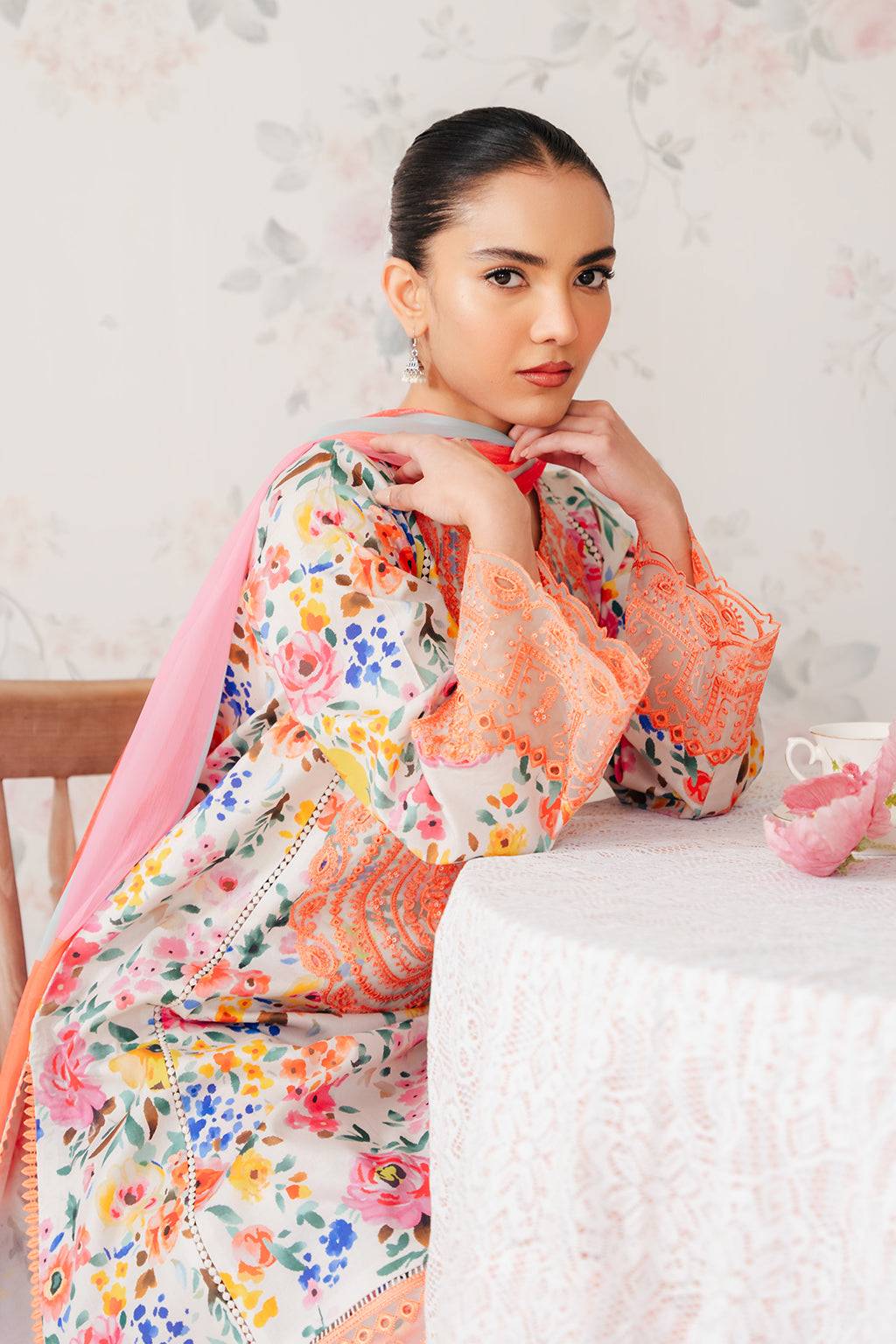 This powder gray unstitched lawn suit from The Floral Charm Collection combines digital printing with refined embroidery for an elegant seasonal look. Featuring a digitally printed front, back, and sleeves, enhanced with embroidered organza neckline and borders, the ensemble is paired with a chiffon digital printed dupatta and cotton digital printed trouser. Perfect for timeless style with modern comfort.