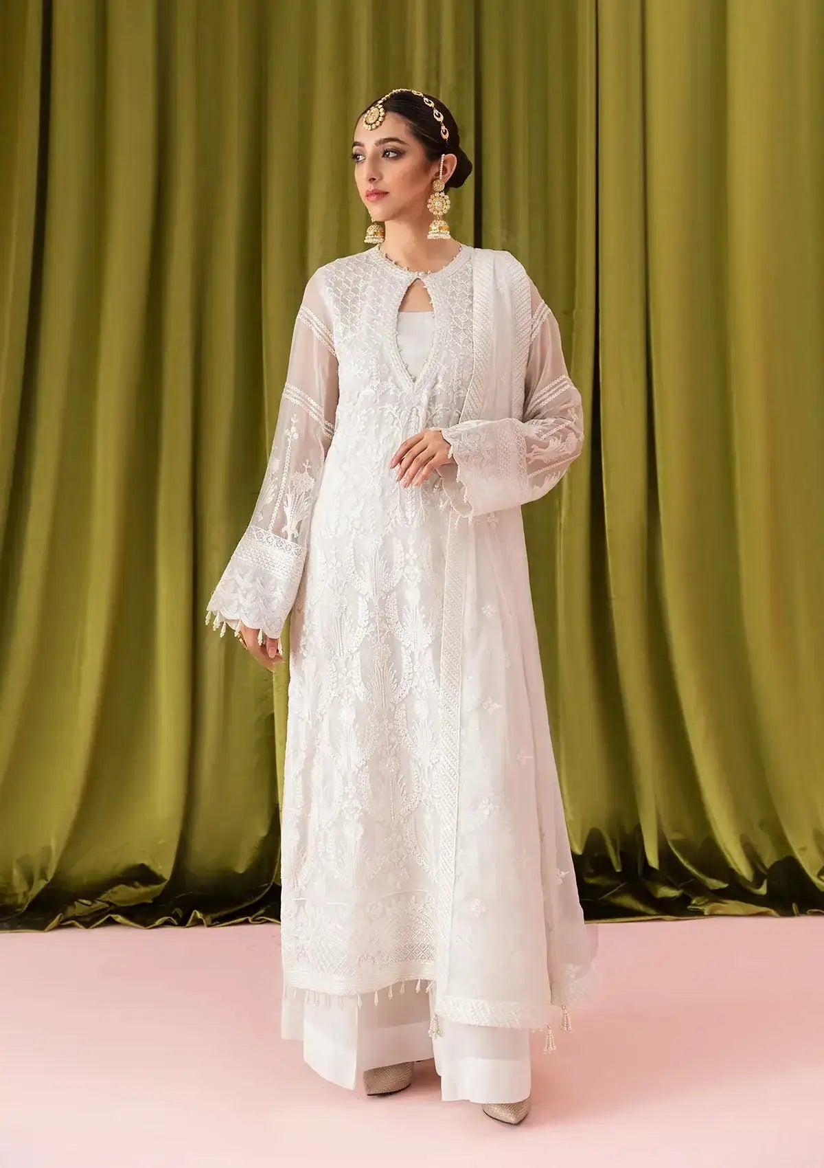 This Aik Atelier formal outfit features an intricately embroidered chiffon front and back, complemented by organza neckline finishing and delicate front and back hem borders. The chiffon sleeves are enhanced with embroidered organza sleeve patches. It is paired with luxurious raw silk pants and a matching embroidered chiffon dupatta with organza border, making it perfect for formal gatherings and special occasions.