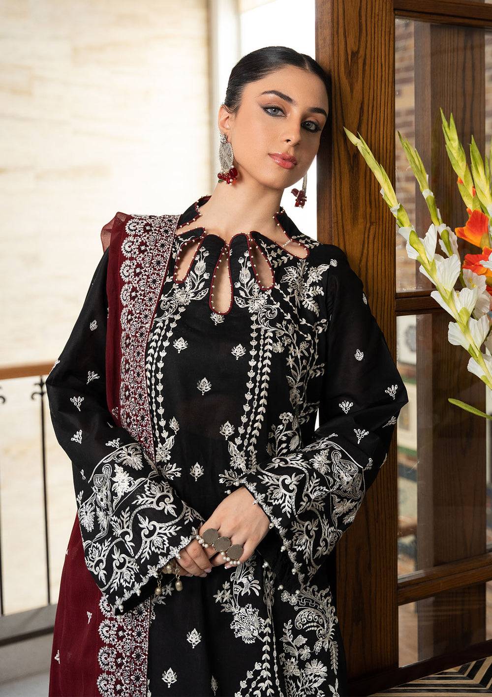 A masterpiece of contrast, this black AIK Atelier design features luxurious white embroidery that gracefully adorns the border and sides of the kameez. Classic Paisley motifs are intertwined with delicate phool bootis, creating a refined and elegant look. It is paired with a vibrant red chiffon dupatta, adding a bold splash of color to the black and white palette, making this outfit perfect for formal gatherings and festive occasions.
