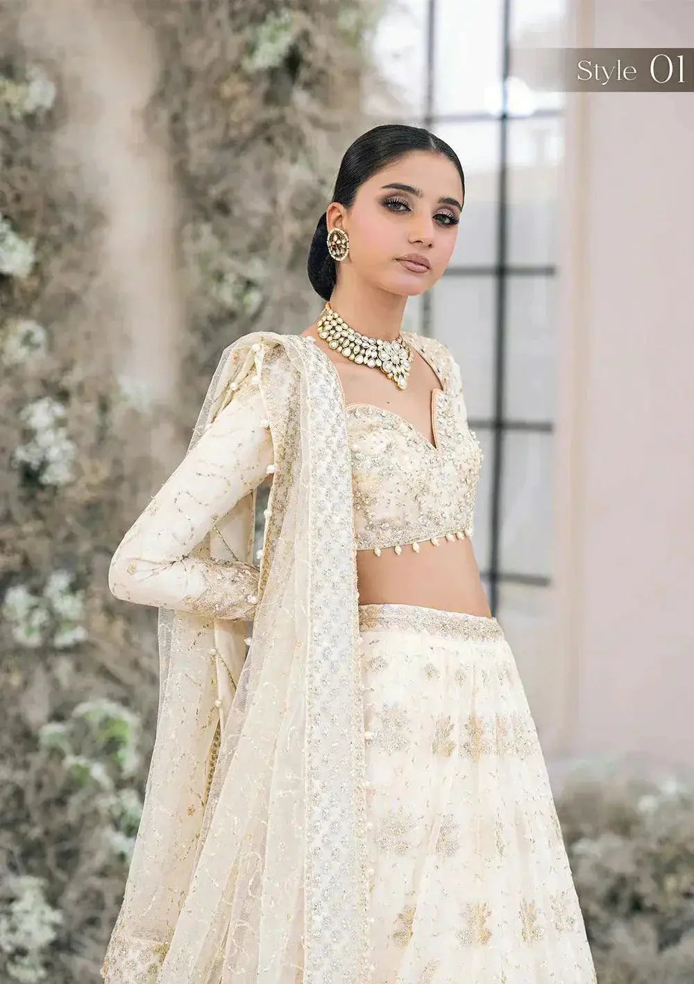 This elegant Aik Atelier ensemble features an embellished and embroidered chiffon front bodice with coordinating embroidered chiffon front and back panels. The neckline is enhanced with organza finishing and intricate jaal work. Sleeves are adorned with matching embroidery and organza borders. Completed with luxurious Jamawaar pants and a delicate embroidered net dupatta with organza border, this outfit embodies a perfect blend of sophistication and traditional artistry, ideal for weddings and festive occasions.
