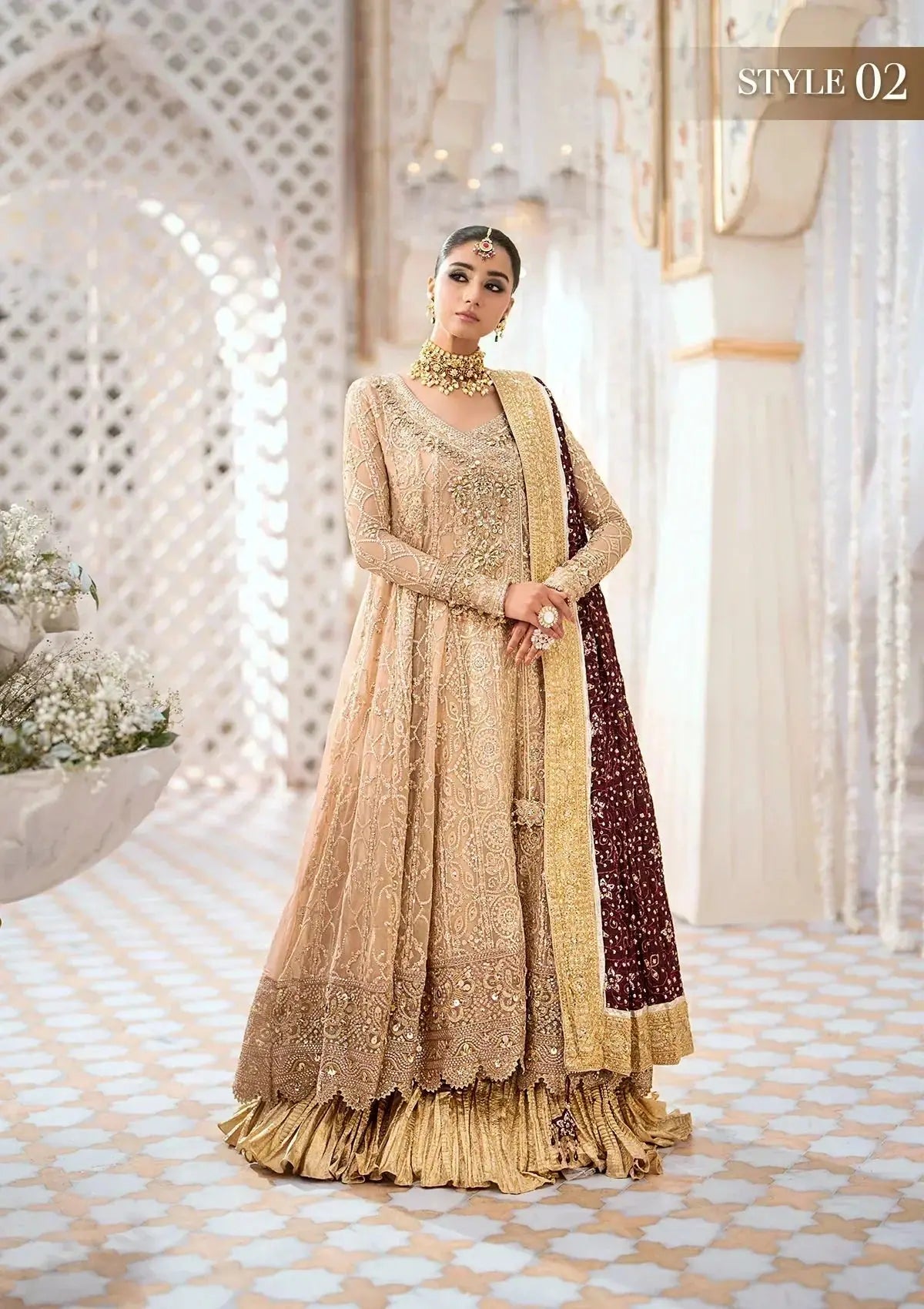 This AIK Atelier gold ensemble features an elegantly embroidered chiffon shirt with organza neckline, front and back borders, and detailed sleeves with matching embroidery. Paired with jamawaar pants and a medium silk dupatta enhanced with tissue border, this outfit embodies festive sophistication and timeless craftsmanship, ideal for weddings and celebratory occasions.