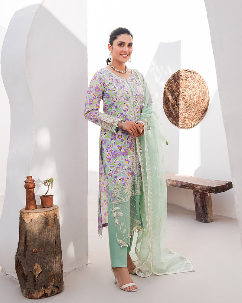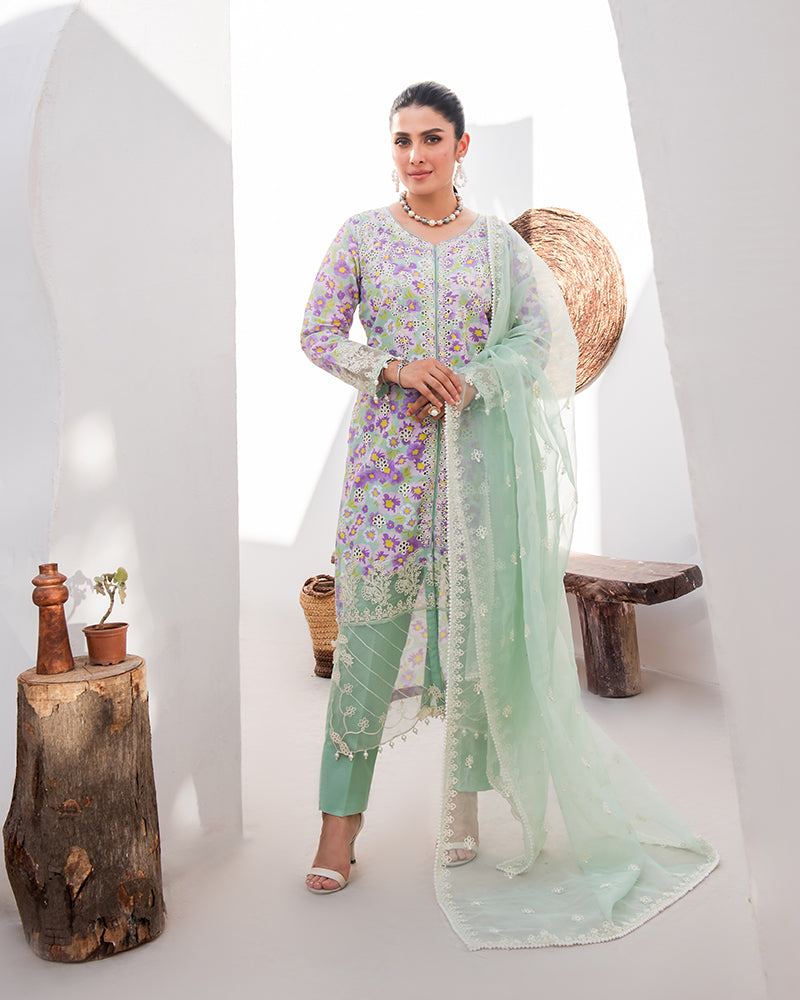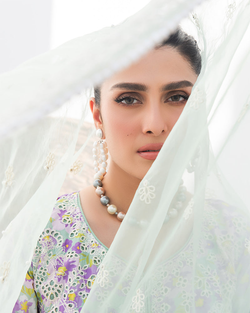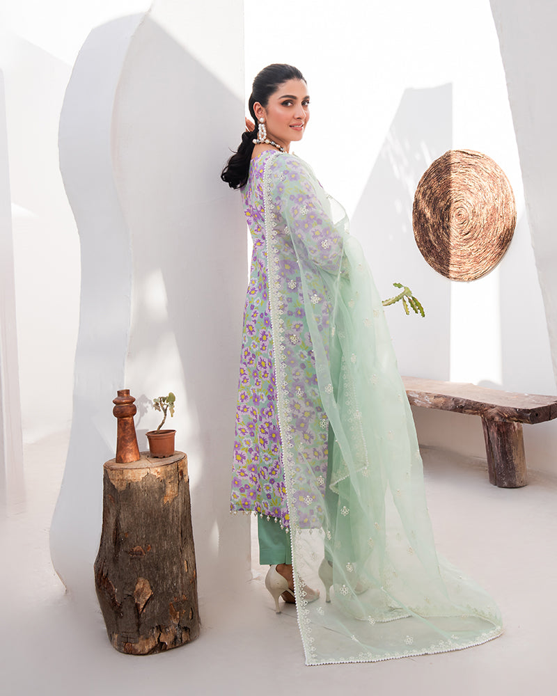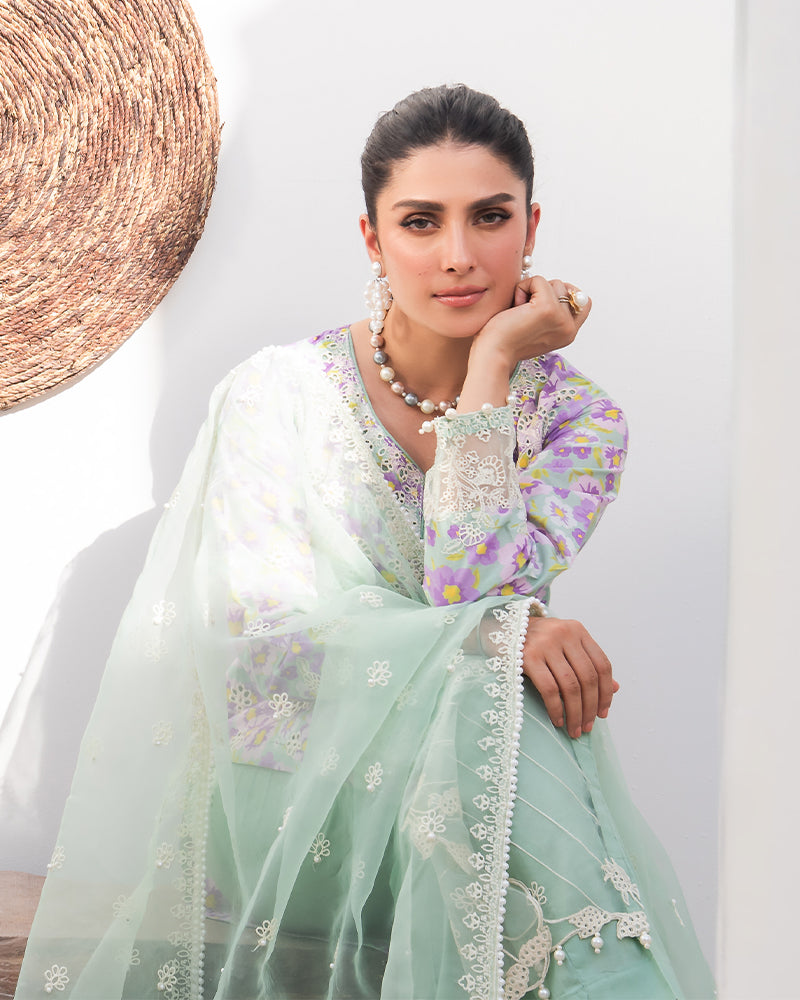 Featuring printed lawn chikankari embroidered shirt consisting of delicate organza embroidery on the bottom and sleeves, adorned with pearls for a touch of sophistication.Complete your look with the matching organza embroidered