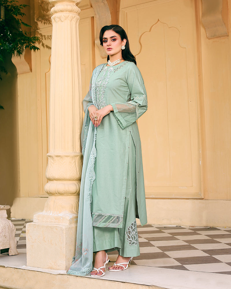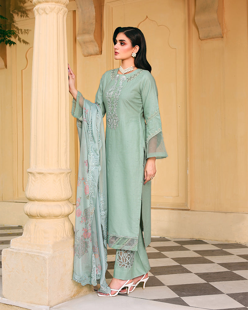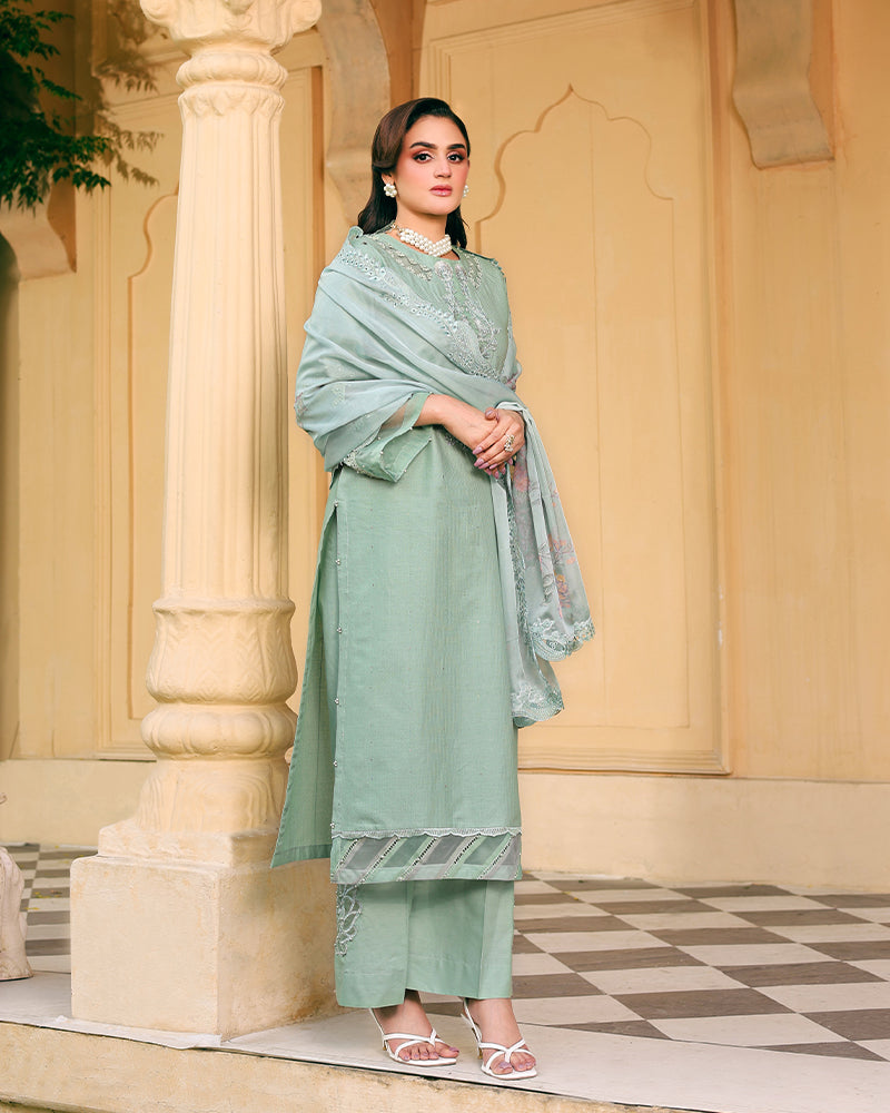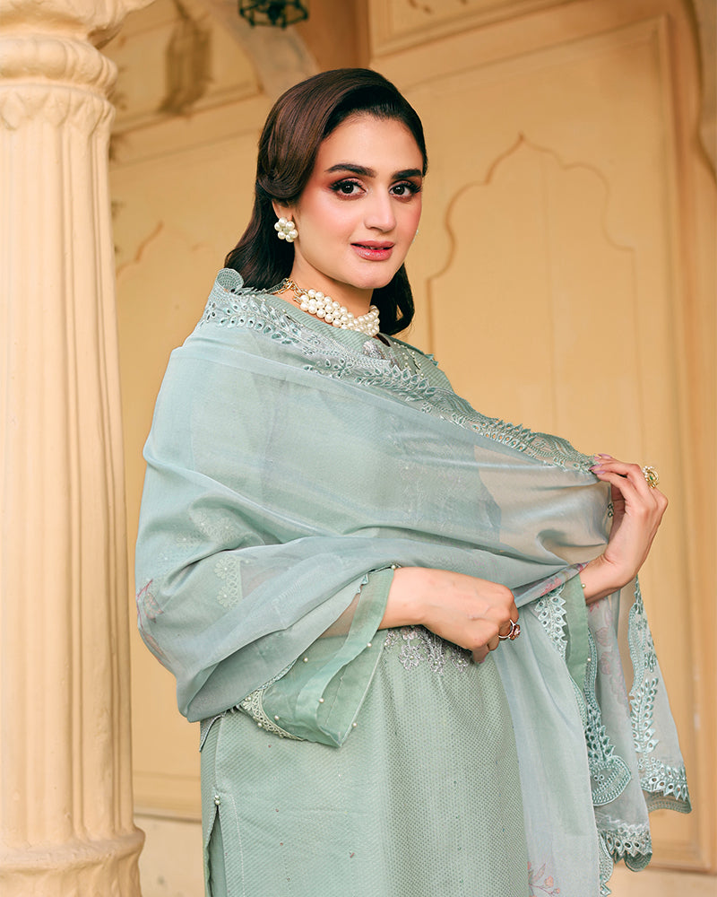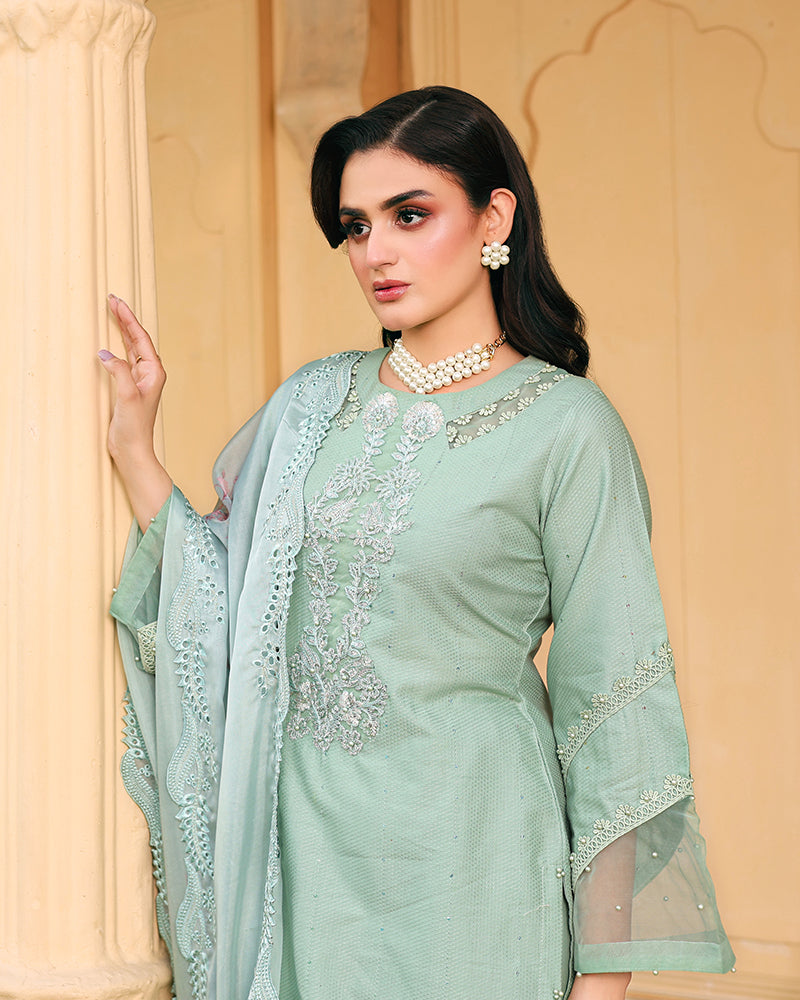 Stunning ensemble! The cotton jacquard shirt features intricate sequin embroidery and pearl embellishments on the sleeves and shirt border, adding a touch of elegance to your look