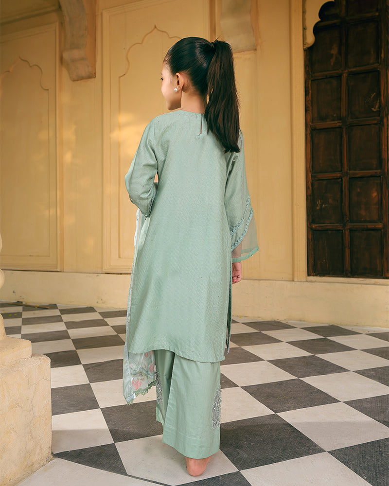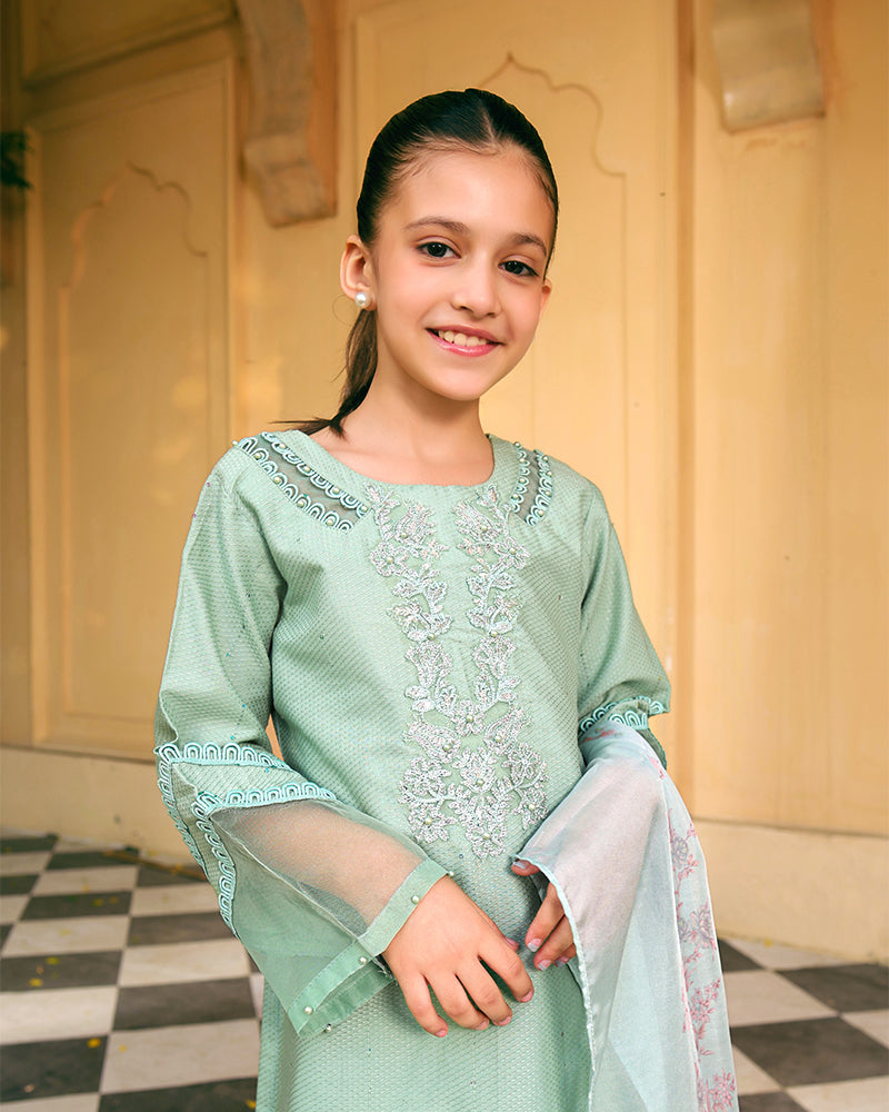 Stunning ensemble! The cotton jacquard shirt features intricate sequin embroidery and pearl embellishments on the sleeves and shirt border, adding a touch of elegance to your look