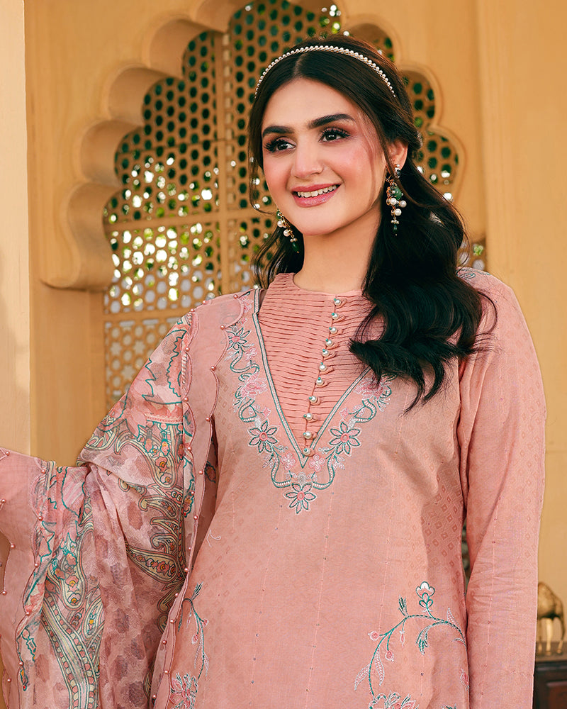 Pair it with the matching printed cotton net jacquard dupatta, which boasts organza embroidery lace and more pearls for added glamour.