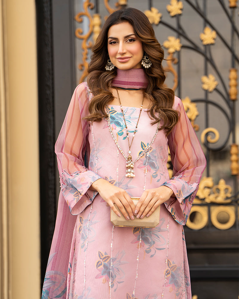 Organza shirt, meticulously crafted with chainwork crystal and diamond spinel detailing, complete with a stunning grip silk digital printed lining Organza digital printed dupatta Grip silk digital print trouser |