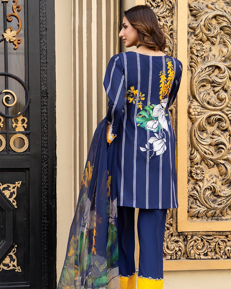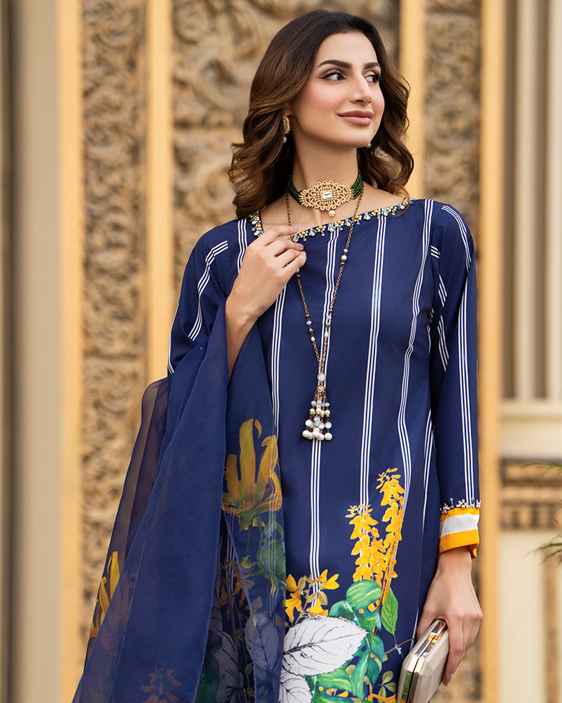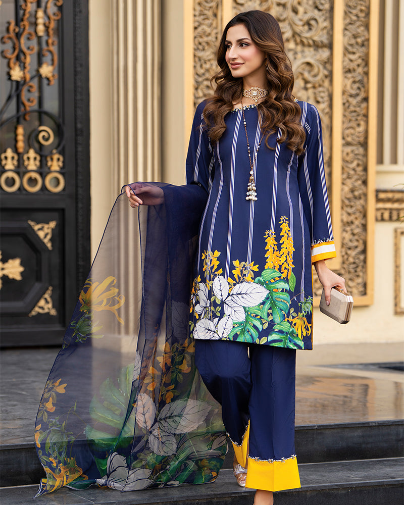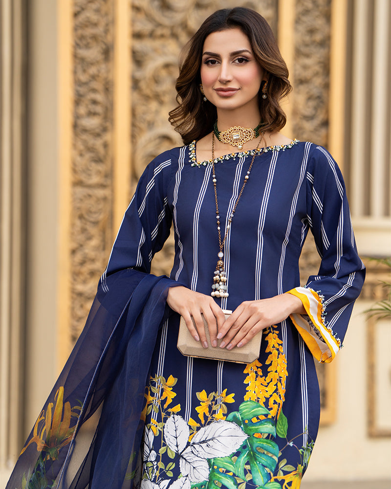 Grip Silk Digital Printed Shirt, meticulously crafted with intricate crystal, pearl, and dabka work on the neckline and sleeves Stunning Organza Digital Printed Dupatta Grip Silk dyed Trouser crafted with pearls and crystal |