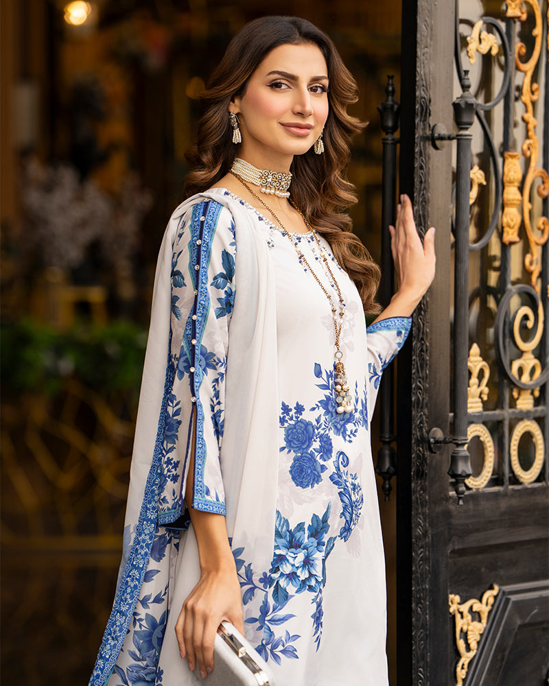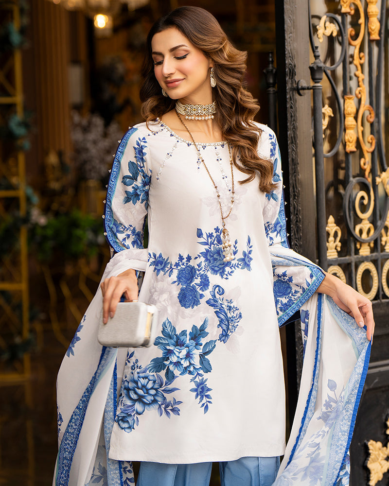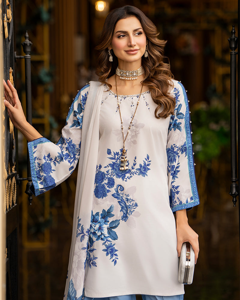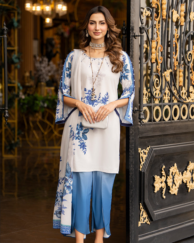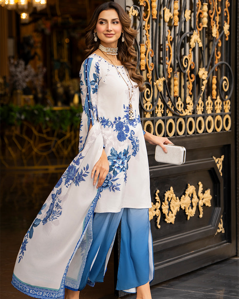 Grip silk digital printed shirt adorned with exquisite pearls and crystal spinel Chiffon silk digital printed dupatta Grip silk gradient culotte |