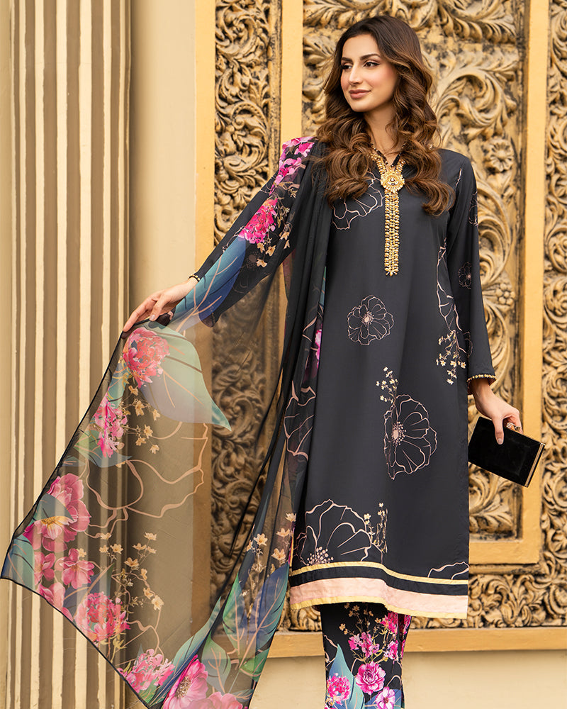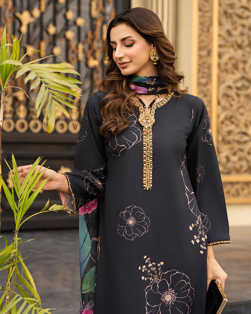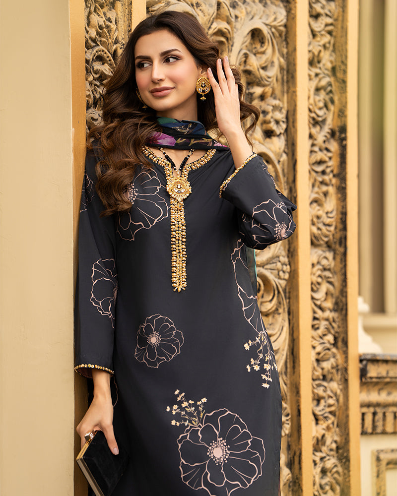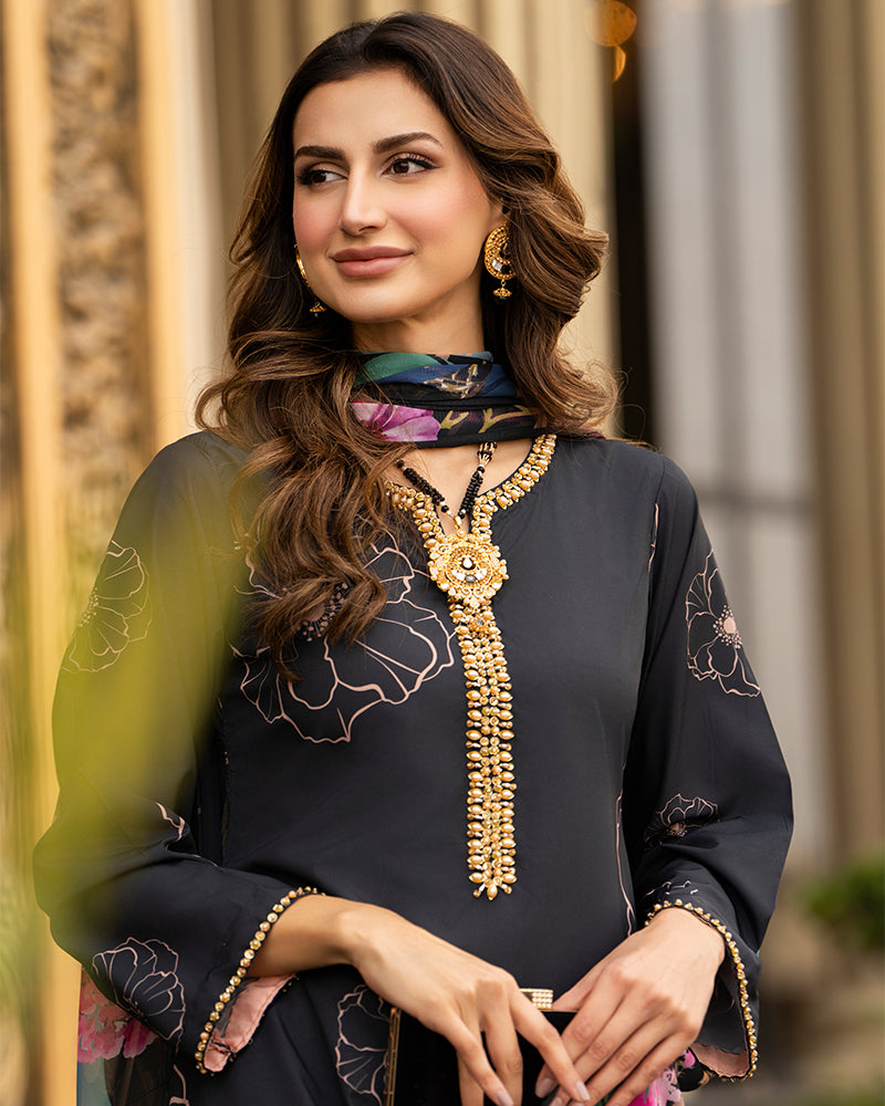 Grip silk digital printed shirt adorned with exquisite pearls, crystals, and sequins Chiffon digital printed dupatta Matching grip silk digital printed trousers |