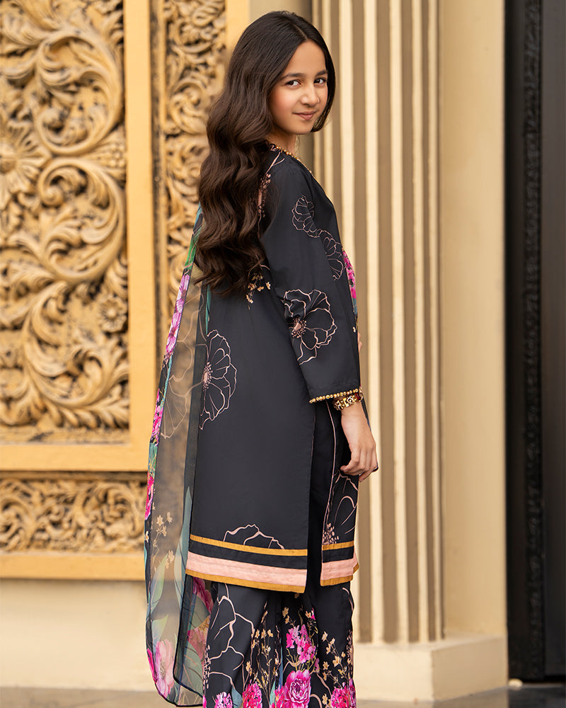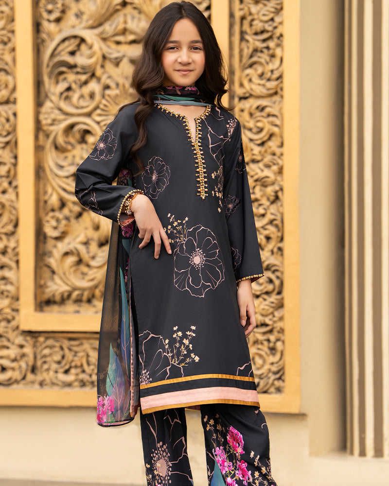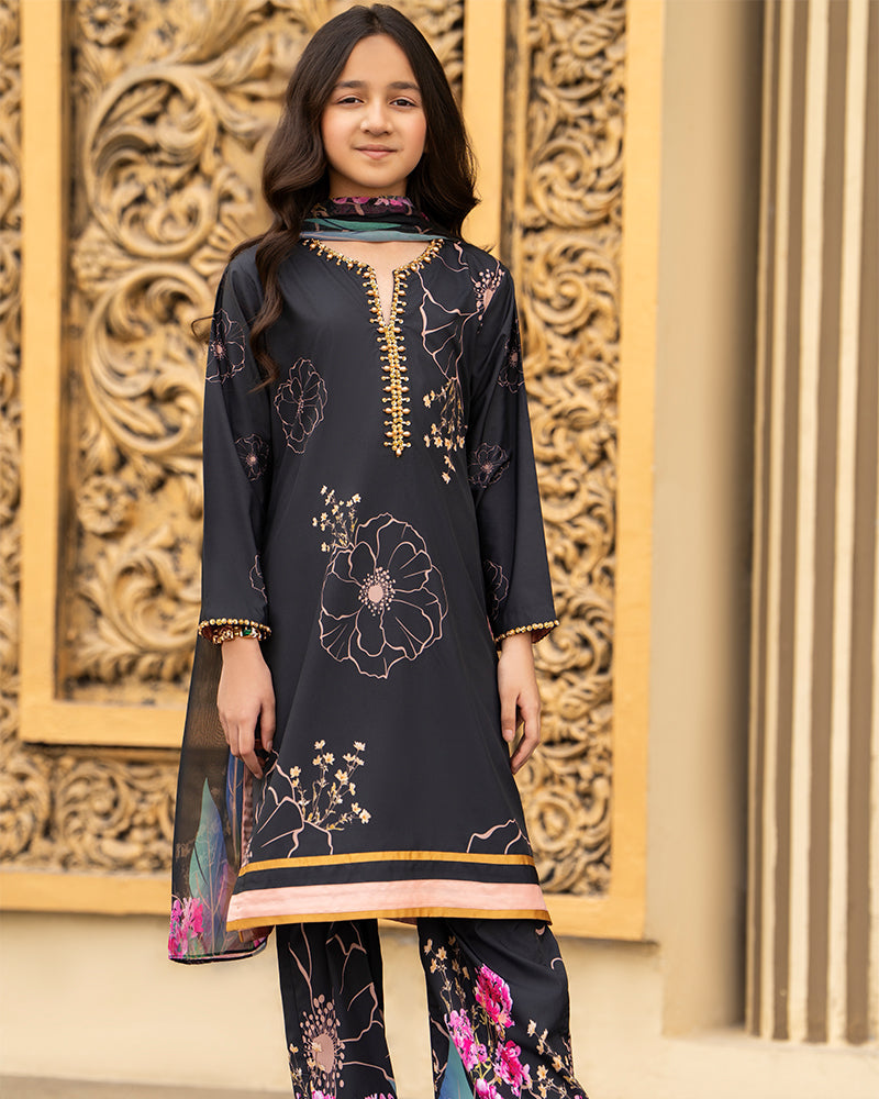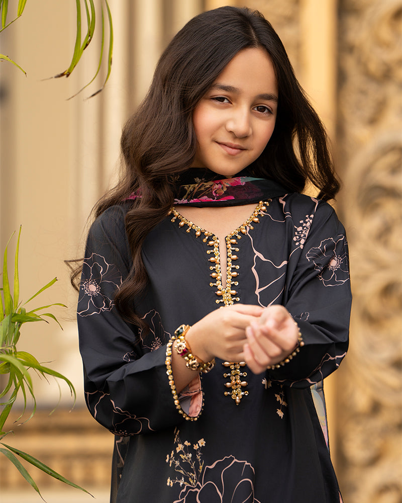 Grip silk digital printed shirt adorned with exquisite pearls, crystals, and sequins Chiffon digital printed dupatta Matching grip silk digital printed trousers |