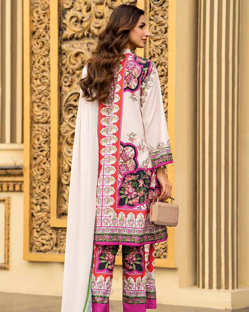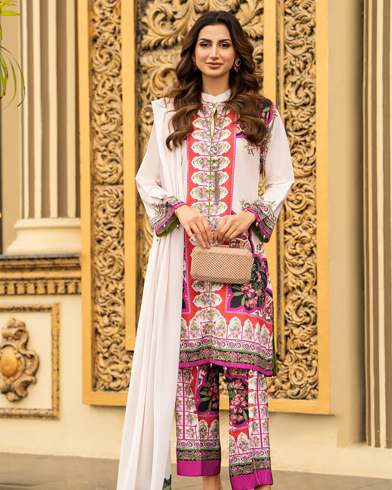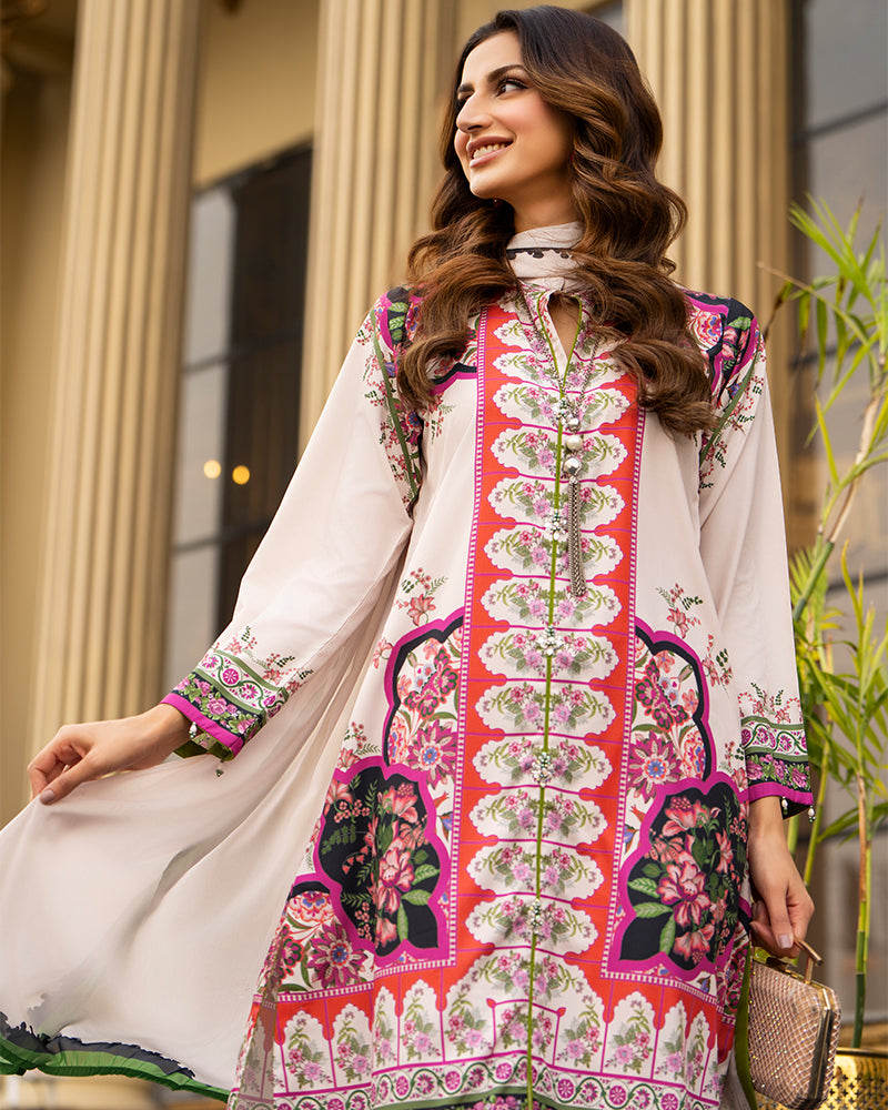 Silk digital printed shirt adorned with exquisite crystal and pearl motifs, finished off with playful tassels Pair it with our matching grip silk digital printed trousers Chiffon digital printed dupatta |