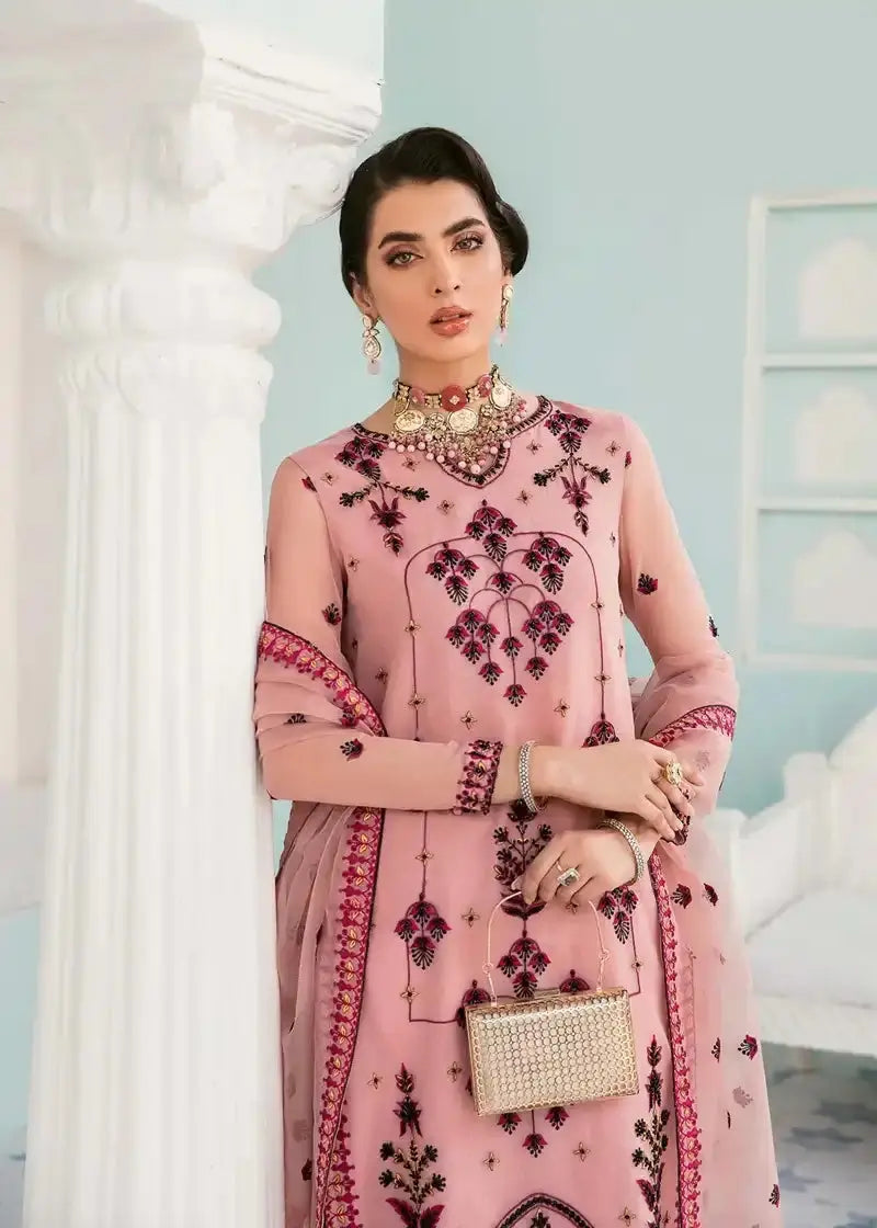 From Akbar Aslam’s Elinor Formals 2022 collection, this outfit is crafted in fine organza with exquisite hand embellishment and embroidery. The delicately adorned neckline and borders enhance its elegance, while the richly worked dupatta with attached pallu border completes the luxurious look. Finished with Russian grip trousers and inner lining, this design makes a graceful formal statement.