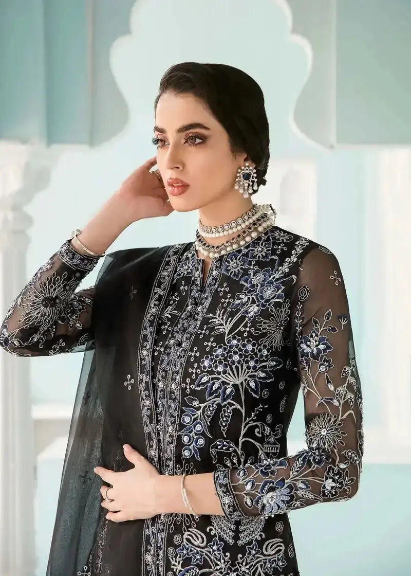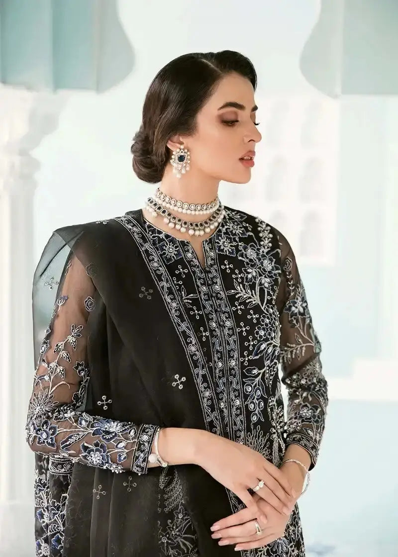 A timeless creation from Akbar Aslam’s Orphic Bridals collection, this organza outfit is richly embroidered and delicately hand-embellished. The ensemble features an intricately adorned front and sleeves, paired with a graceful embroidered dupatta enhanced with a statement pallu border. Complemented with Russian grip trousers and inner lining, it is an elegant bridal statement.