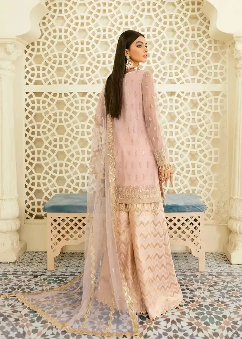 A graceful creation from Akbar Aslam’s Elinor Formals Vol 1, featuring delicate net embroidery with hand-embellished details. The neckline is adorned with ornate embellishments, while the dupatta and jacquard trouser add refinement to this elegant ensemble, making it an ideal choice for festive and wedding occasions.