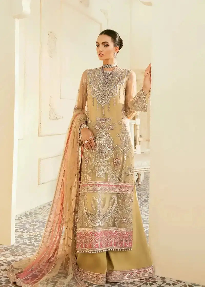 An exquisite masterpiece from Akbar Aslam’s Libas-e-Khas Collection, featuring multiple net embroidered panels with intricate hand embellishment. The embellished blouse, detailed borders, and delicate dupatta exude sophistication. Completed with a cotton silk inner, this ensemble is perfect for weddings and festive occasions where grandeur meets elegance.