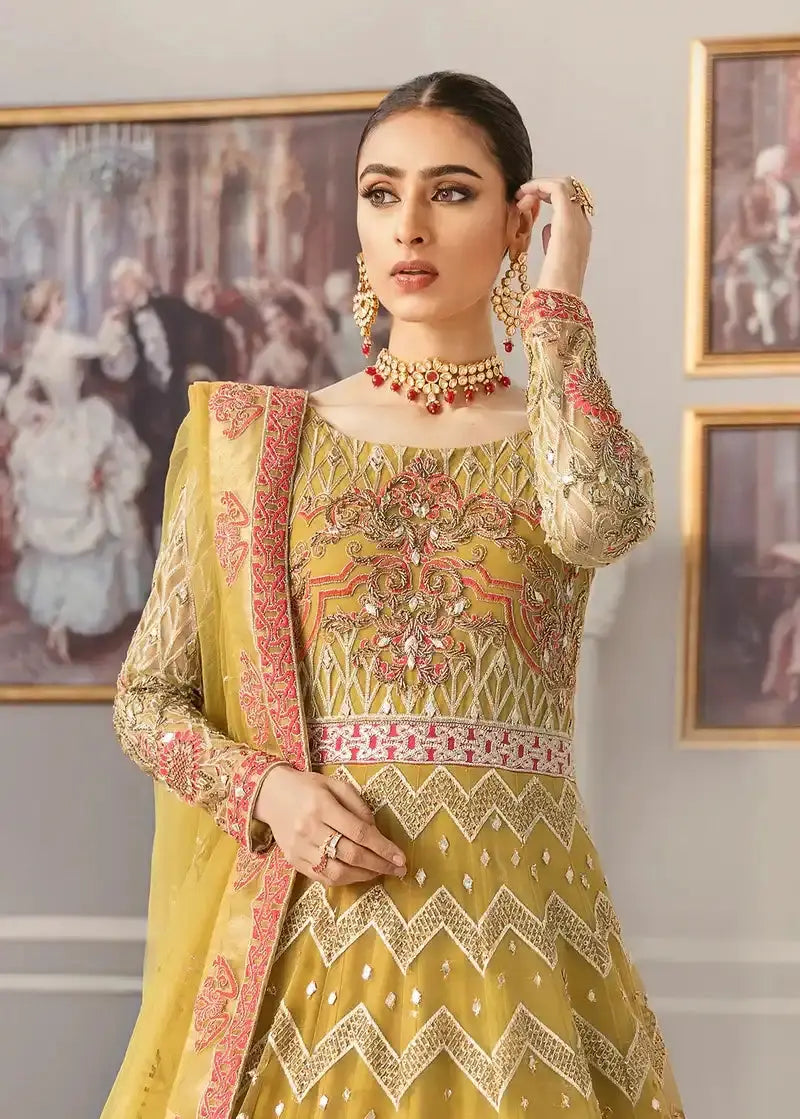 From Akbar Aslam’s Formal Collection, this masterpiece captures refined elegance and meticulous craftsmanship. Featuring a hand-embellished net front with multiple panels, intricately embroidered borders, and a luxurious dupatta, the ensemble is completed with a Russian grip inner for structure and comfort. Ideal for weddings and festive occasions, this design exudes timeless sophistication.