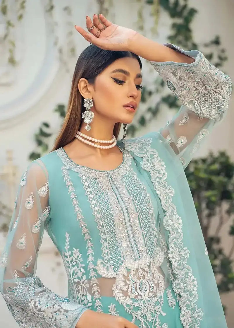 An exquisite ensemble from Akbar Aslam’s Libas-e-Khas Collection, crafted with precision and grace. The net shirt, adorned with delicate hand-embellished embroidery and an intricately worked neckline, radiates elegance. Complemented by embroidered sleeves, a finely detailed dupatta with organza pallu, and a coordinating trouser with inner, this design is perfect for creating a refined statement at festive and wedding occasions.