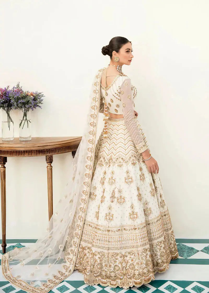 This off-white bridal ensemble from Akbar Aslam’s Orphic Bridals collection features a bamber chiffon blouse and dupatta with intricate hand-embellished embroidery. The front and back blouse, sleeves, and lehenga panels are adorned with delicate organza embroidery, complemented by tissue-embroidered dupatta borders and a belt border. The Russian grip inner provides structure and comfort, making this outfit perfect for weddings and bridal occasions, radiating elegance and sophistication.