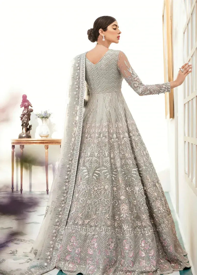 This pastel green bridal ensemble from Akbar Aslam’s Orphic Bridals collection features a net blouse and dupatta with 16 hand-embroidered panels on the front and back. The front and back blouse, as well as the sleeves, are meticulously hand-embellished, complemented by organza embroidered borders for the lehenga, belt, and dupatta sides. The Russian grip inner adds structure and comfort. Ideal for weddings and bridal occasions, this outfit radiates elegance and sophistication.