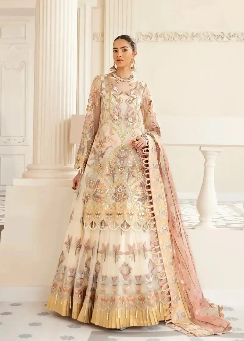 This exquisite design from Akbar Aslam’s Raqi Collection is a blend of luxury and finesse. Crafted on premium net and tissue fabrics with rich hand embellishments, it features a detailed dupatta with layered borders and an optional net lehenga for a more regal look. Perfect for weddings and festive occasions.