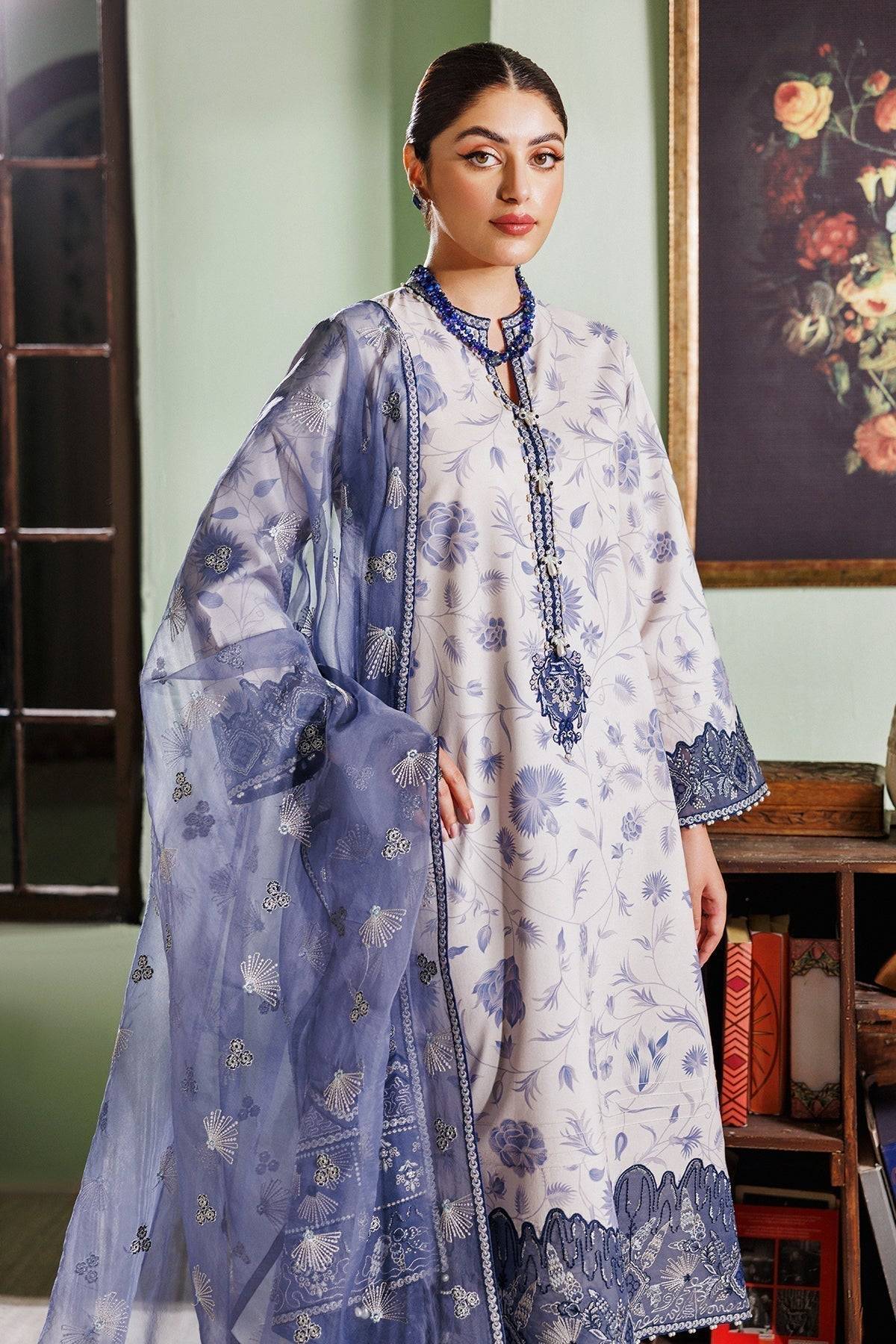 This Pastel Gray digital printed lawn set features a shirt and trouser combination adorned with intricate organza embroidery. The shirt showcases an embroidered neckline patch, front daman border, front and back chalk, neck and dupatta patti, as well as embroidered sleeves and trouser borders. The ensemble is complemented by an embroidered organza dupatta with a detailed pallu, creating a sophisticated look suitable for formal gatherings, festive occasions, or casual celebrations.