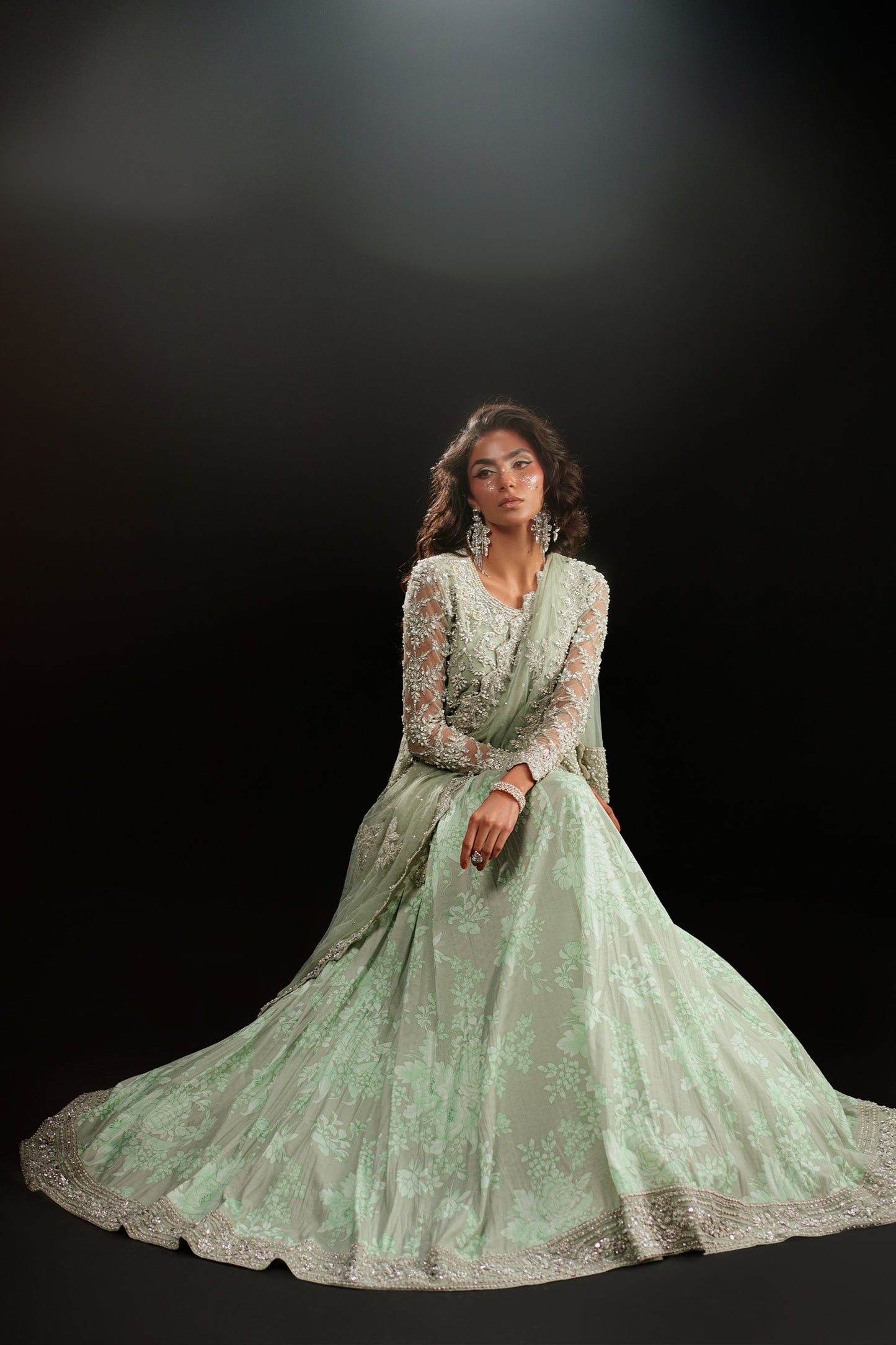 A gorgeous AK print is composed for this lovely lehenga and blouse with a jewelled jacket to complete the look. The striking jacket is heavily hand embellished using sparkling crystals, beads, pearls, and sequins. A tulle/net dupatta comes with worked borders and an all over motif spray. Oozing with feminine charm, this design is just the best way to step into spring festivities.
