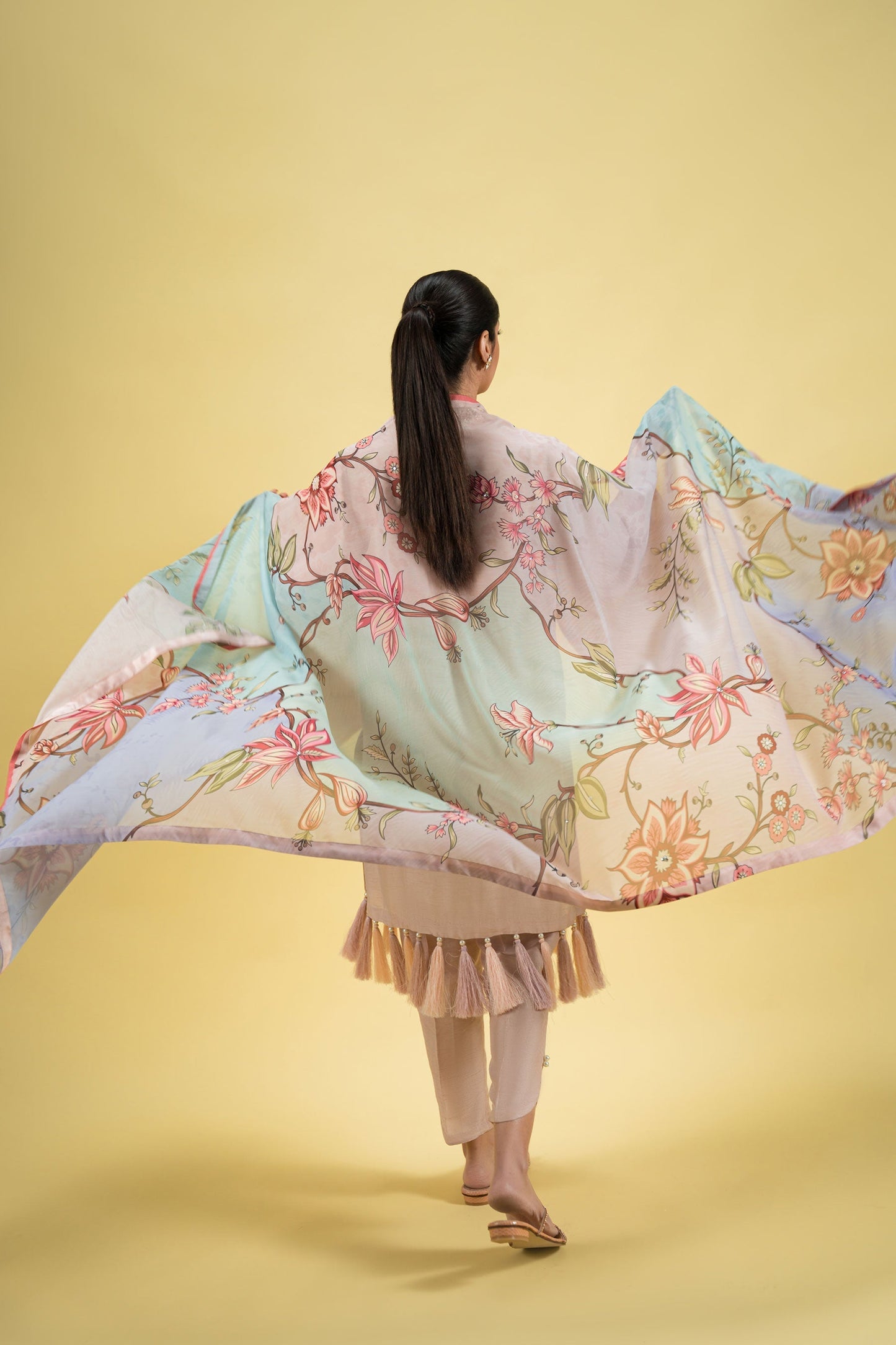 Subtle and elegant this beautiful design comes with flowy tulip sleeves, shaded tassels and fine hand embellishment on the neckline, along with frayed detailing. Delicate sequins and resham work adds a soft sparkle. Straight cut pants with pearl detailing and a beautiful floral AK print dupatta completes the look. Charming and timeless.
