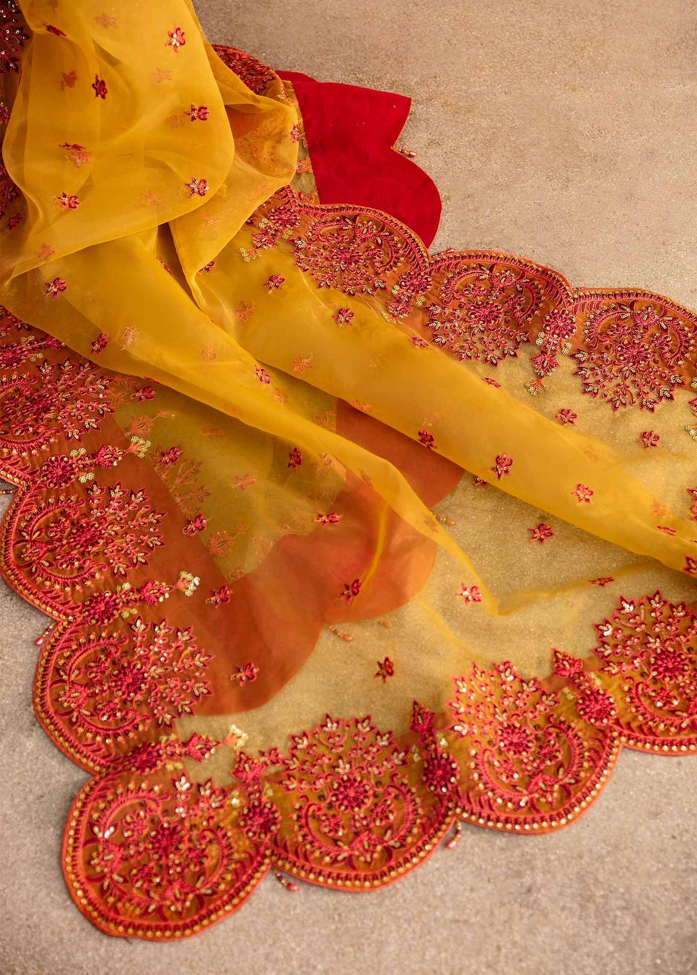 An exquisite design crafted on Korean raw silk with detailed hand embellishments on the front and sleeves. The elegant organza dupatta with embroidery and a graceful Russian grip palazzo complete this festive and wedding-perfect ensemble.