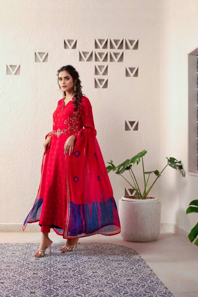 Khaadi net shirt comes with delicate handwork on front, stitching details on the neckline and sleeves paired with raw silk pants and tie dye khaadi net dupatta