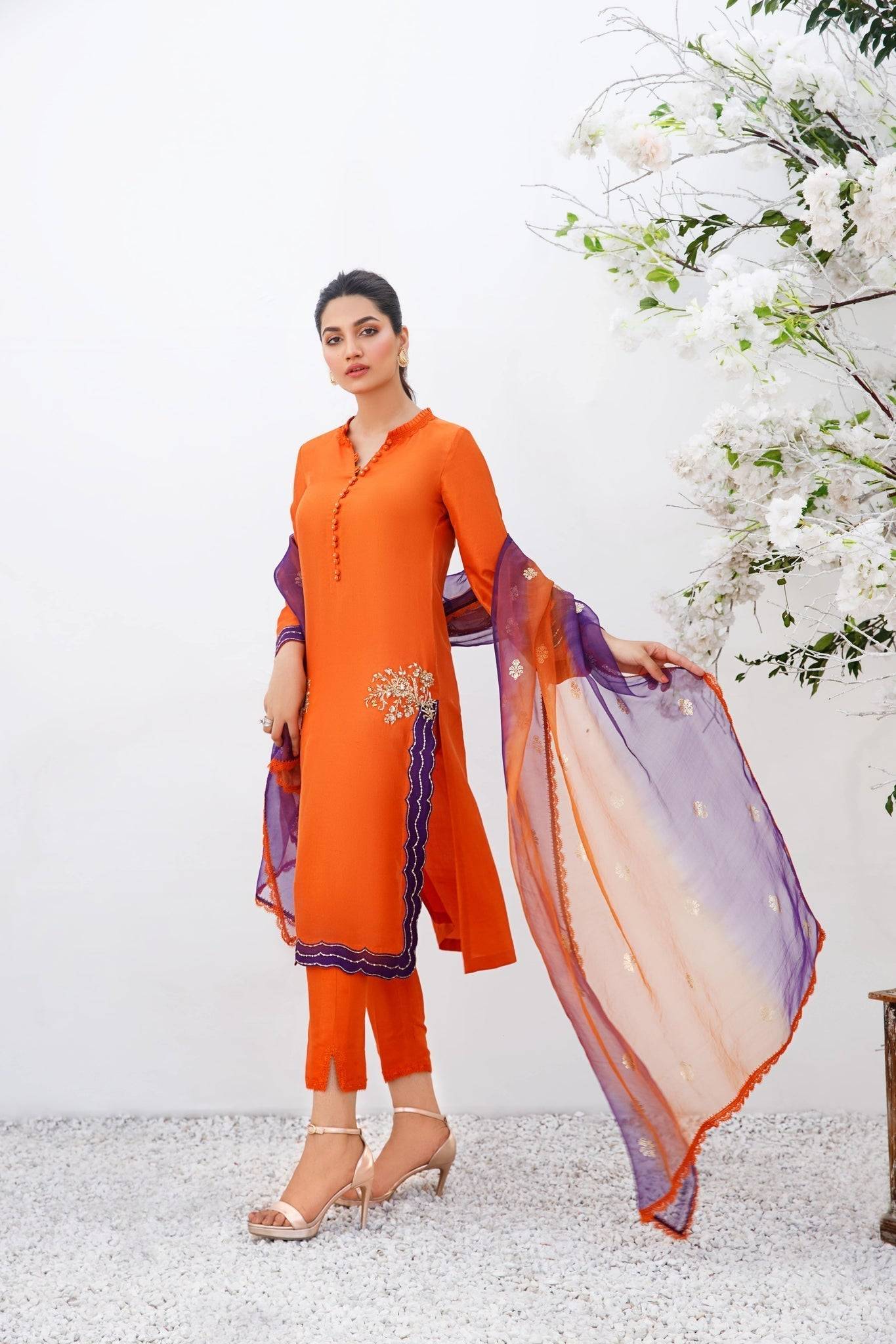 This design features a Blazing Orange raw silk shirt with purple applique and handwork around the hem and sleeves, paired with rawsilk pants and organza 2 toned foil printed dupatta with lace edging.