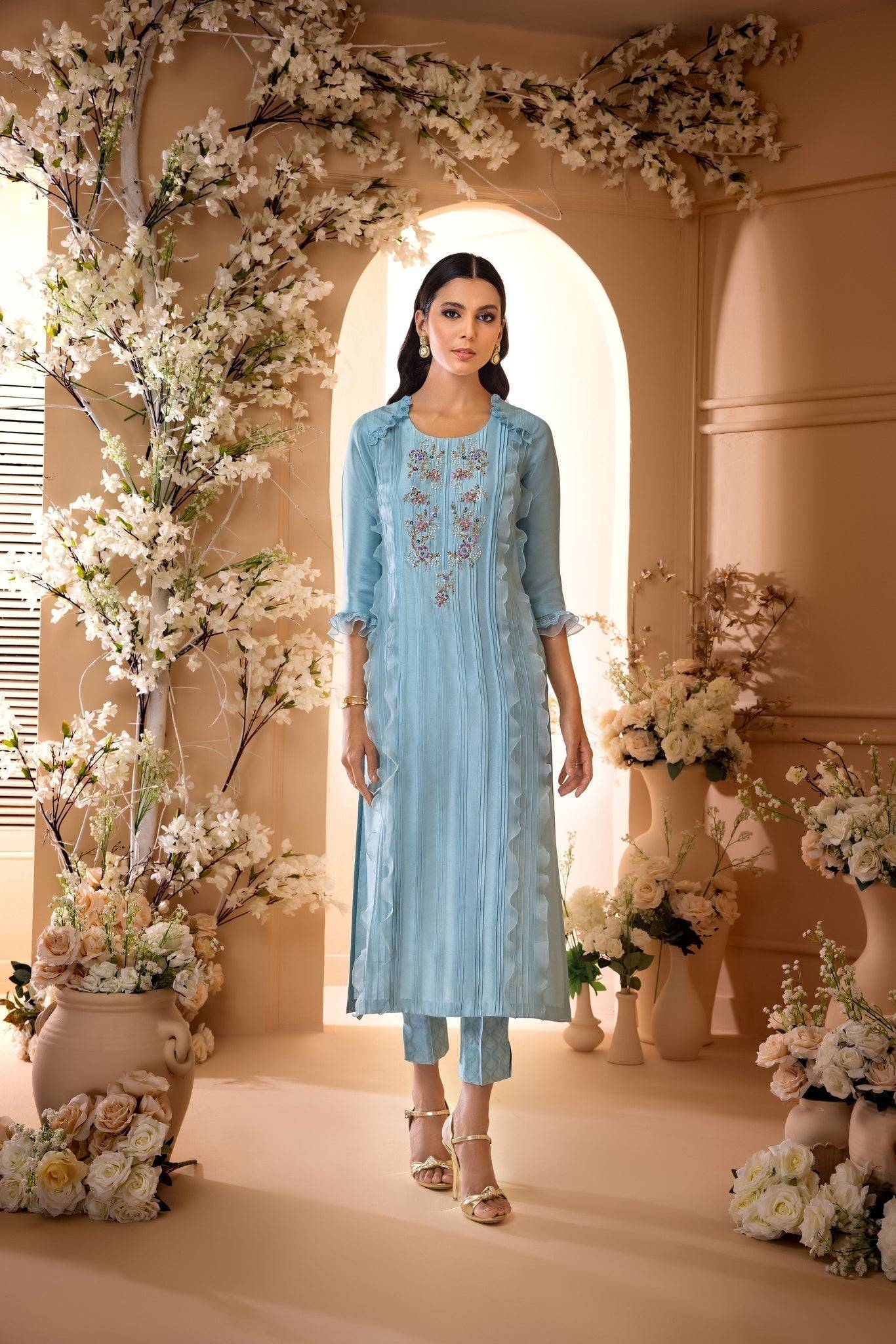 The shirt is made of pure raw-silk material. The front of the shirt is beautifully adorned with feather-like frills accentuated by pleats while the neckline has delicate hand-embellished embroidery.