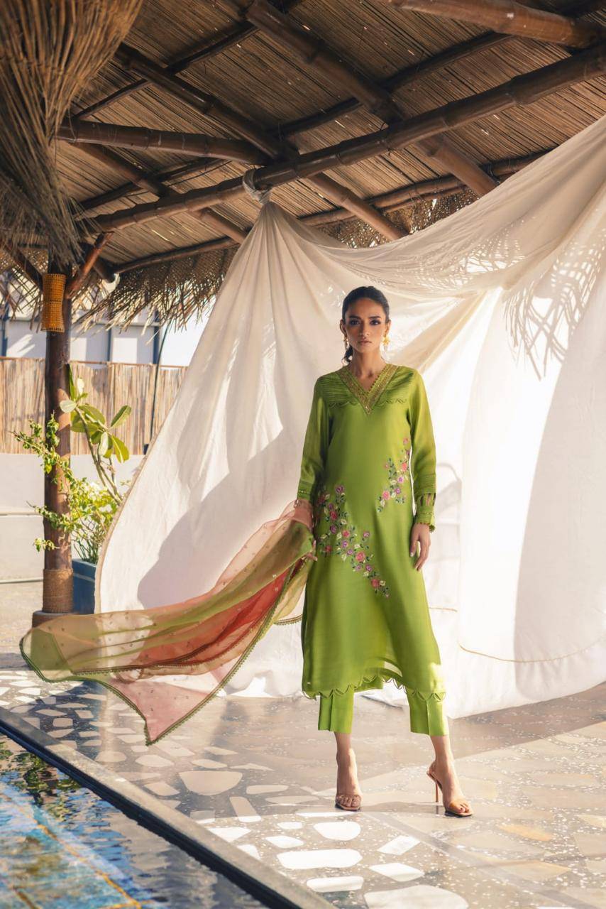 Infuse your wardrobe with our lime green silk ensemble, adorned with exquisite handwork on the neck and colorful embroidery on the front. Paired effortlessly with silk pants and a shaded screen printed dupatta for a timeless look.