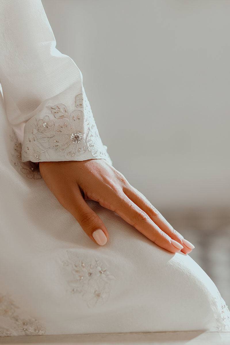 Dress elegantly in our timeless raw silk white shirt adorned with floral shadow work embroidery. Paired with our signature palazzo pants featuring floral motifs appliquédd on them, completing the ensemble with a white medium silk dupatta.