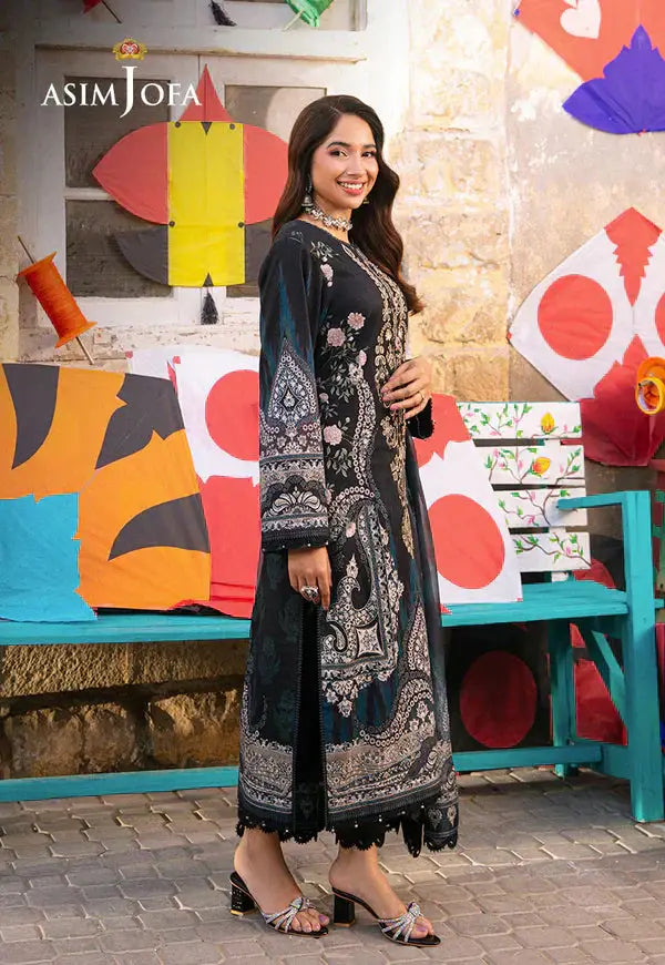 This sophisticated black ensemble from Asim Jofa features a digital jacquard shirt with an intricately embroidered neckline on organza. Paired with dyed cambric trousers and a flowing digital butter silk dupatta, the 3-piece set combines elegance with comfort. Ideal for festive gatherings, casual outings, or semi-formal occasions, it offers a refined and graceful look.