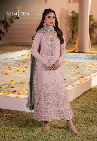 A delicate pink ensemble from the Asim Jofa Dhanak Rang collection, blending traditional craftsmanship with contemporary elegance. The shirt showcases an embroidered front center panel, right and left side panels, 30'' embroidered back with border, pair of embroidered sleeves with border, 30'' embroidered front daman border, and 2.5 meters embroidered border for front and back chaak. Paired with a 2.5-meter chiffon dupatta and 1.5 meters dyed wide-width boski silk for the trouser, this outfit is perfect for festive celebrations and elegant gatherings.