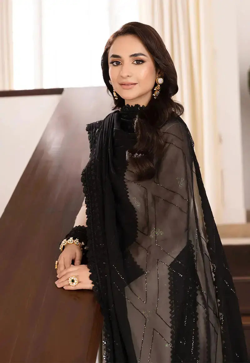 This striking black ensemble from Asim Jofa’s features a dull satin shirt with an embroidered neckline, complemented by embroidered front, back, and sleeves on chiffon. A 1.25-meter embroidered chaak border for the front, 30” embroidered sleeve borders matching the chaak, and 1.5 meters embroidered border for front and back add elegance to the design. The outfit is completed with a 2.5-meter embroidered chiffon dupatta and wide-width dyed dull satin trousers, forming a 3-piece set perfect for festive and semi-formal occasions.