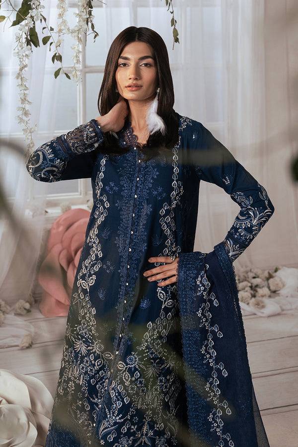 An elegant navy blue ensemble from Ayzel’s Eudora Luxury Lawn 24 Collection, combining refined embroidery with modern charm. The lawn shirt features embroidered front panels and back, with matching embroidered sleeves enhanced by organza embroidered front, back, and sleeves borders. The cotton net dupatta is beautifully embroidered with pallu borders, paired with a cotton dyed trouser for a complete sophisticated look. Perfect for festive occasions, semi-formal gatherings, or stylish daytime events.