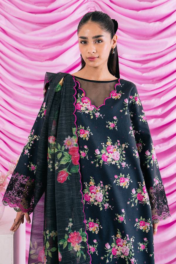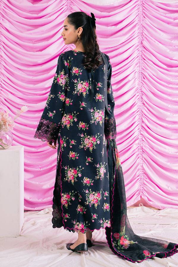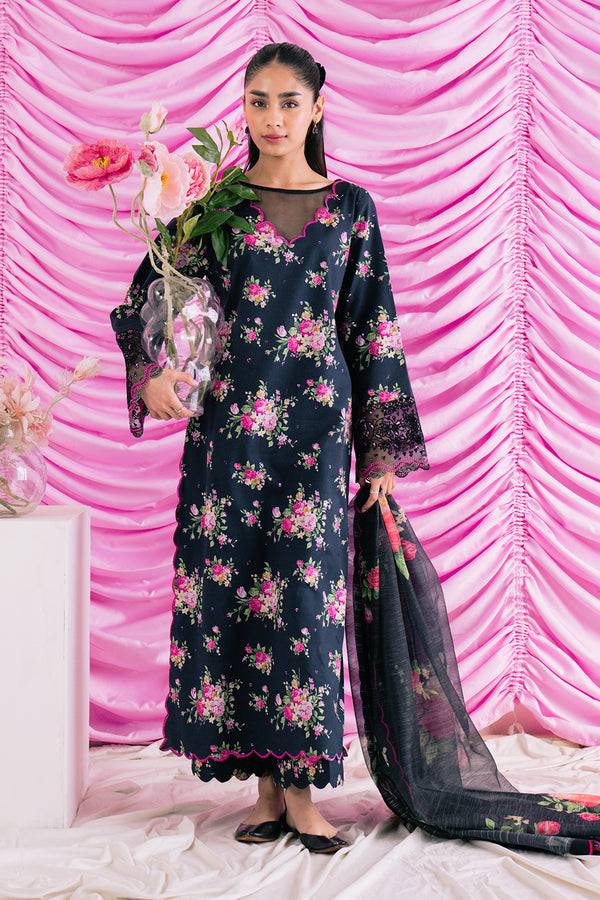 This black outfit from Ayzel’s Renisa Lawn Collection brings together striking embroidery and digital prints for a bold and graceful look. The lawn shirt features an embroidered digital printed front with matching printed sleeves, complemented by a digitally printed back for a complete design. Organza embroidered sleeve borders add refined detailing, while the cotton net digital printed dupatta elevates the outfit with a breezy charm. The cotton digitally printed trouser completes the ensemble, making it an elegant choice for daytime events and semi-formal gatherings.
