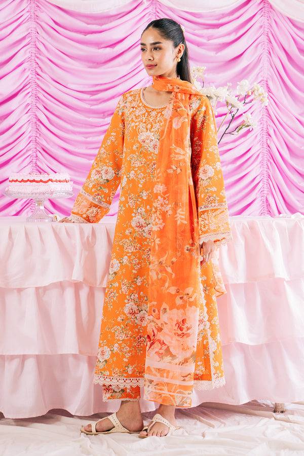 This peach ensemble from Ayzel’s Renisa Lawn Collection blends digital prints with delicate embroidery for a timeless summer look. The lawn shirt showcases an embroidered digital printed front, with a digitally printed back and sleeves for a complete design flow. Organza embroidered sleeve borders add a refined finish, while the chiffon digital printed dupatta gives a light and airy touch. Paired with a digitally printed cotton trouser, this outfit is both elegant and comfortable—perfect for daytime gatherings and festive wear.