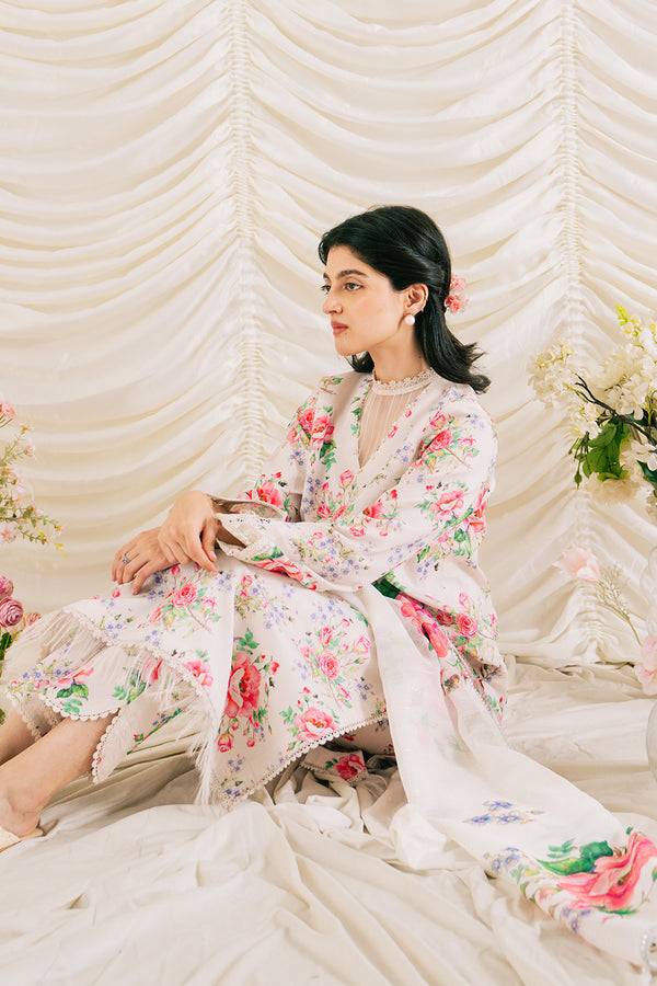 This skin-toned outfit from Ayzel’s Renisa Lawn Collection combines subtle elegance with refined detailing. The lawn shirt is digitally printed and enhanced with an organza embroidered neckline patch for a sophisticated finish. The Monar digital printed dupatta adds a delicate, flowing charm, while the cotton digital printed trouser completes the ensemble with comfort and ease. A perfect choice for daytime events, casual gatherings, or festive occasions.