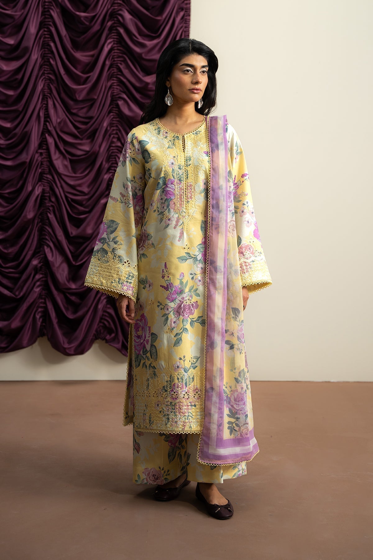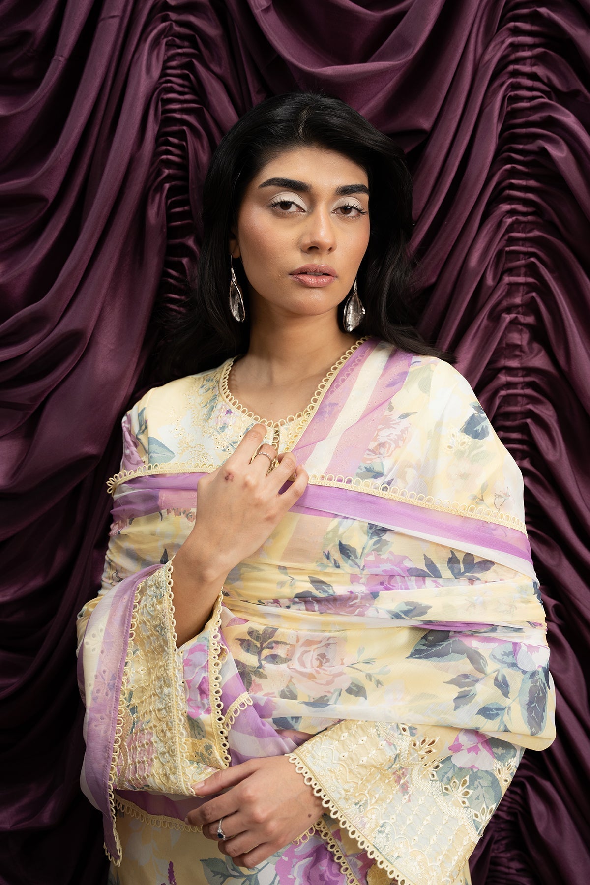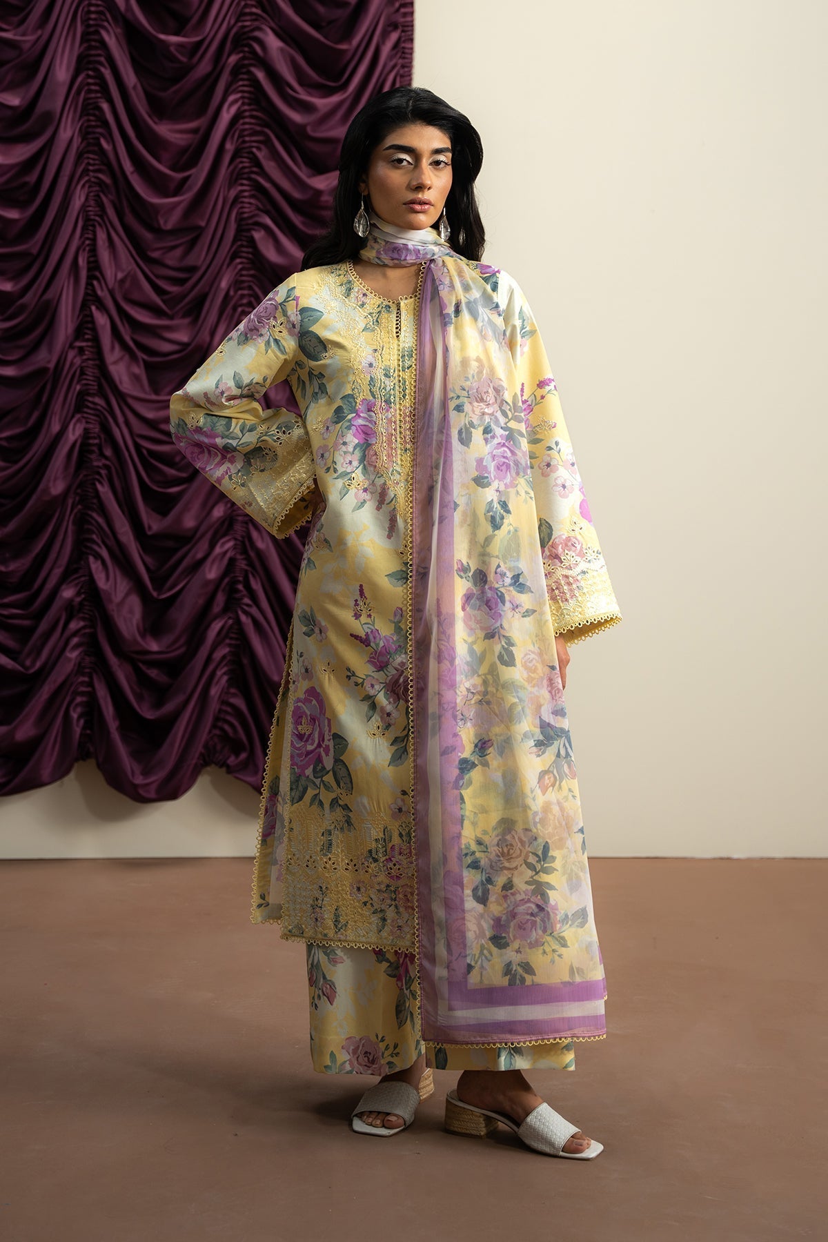 Fabric: Shirt (Lawn – Printed/Embroidered), Dupatta (Organza – Printed/Embroidered), Trouser (Dyed Cotton Culotte)