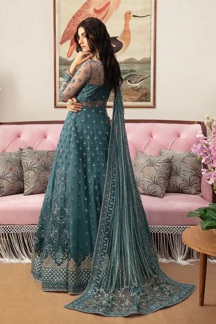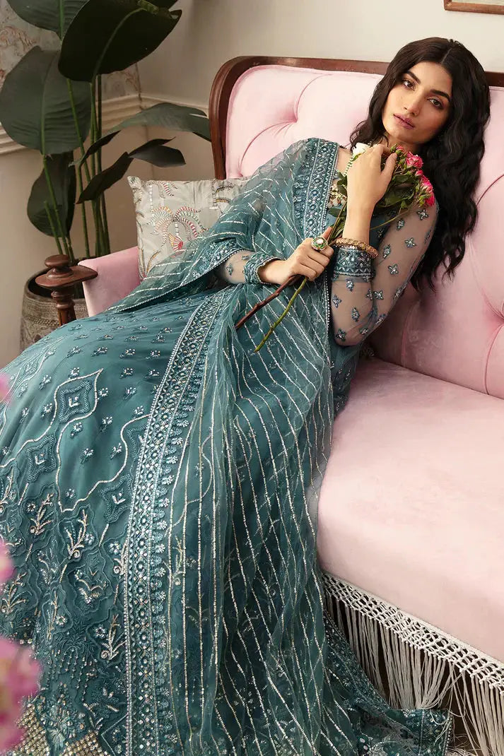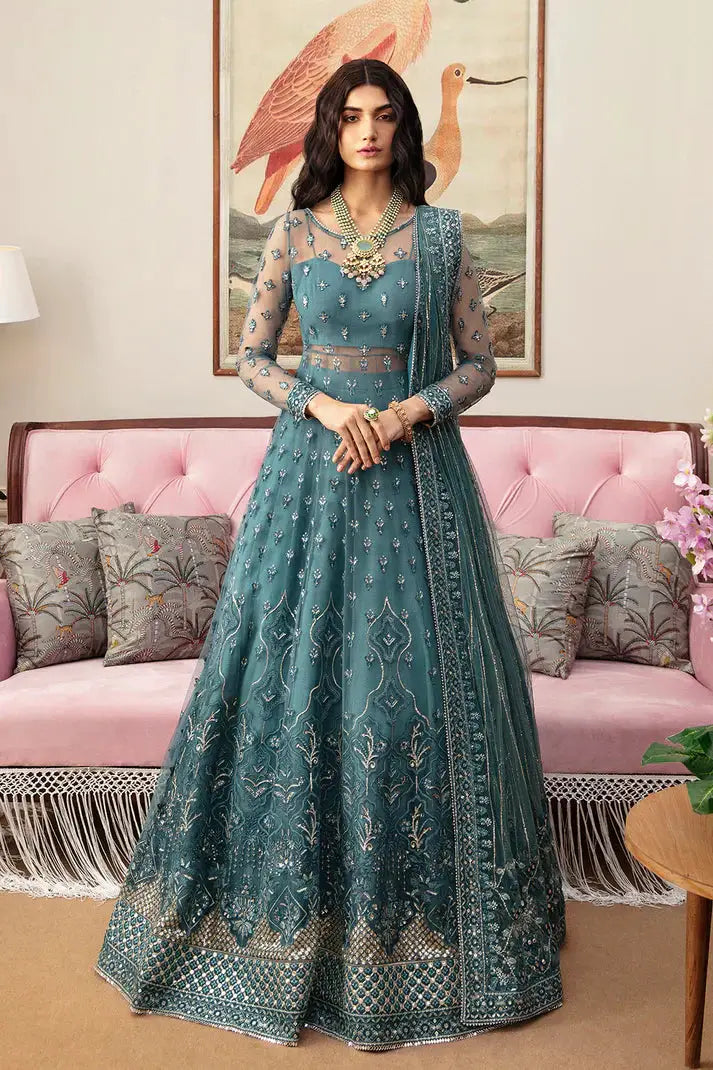 A breathtaking ensemble from Afrozeh’s Whispers of Grandeur collection, designed with opulent detailing for an unmistakably regal look. The net embroidered front and back body is enhanced with seven front and seven back embroidered panels, creating a magnificent structure. Dual organza embroidered borders (Style A & B) elevate the shirt’s silhouette, adding layers of sophistication. The net embroidered sleeves, paired with organza sleeve borders, carry an ethereal charm. A delicately embroidered net dupatta, accentuated with pallu border A motifs and pallu border B embroidery, lends a graceful finish. Completed with a raw silk dyed trouser, this outfit is the epitome of timeless grandeur.