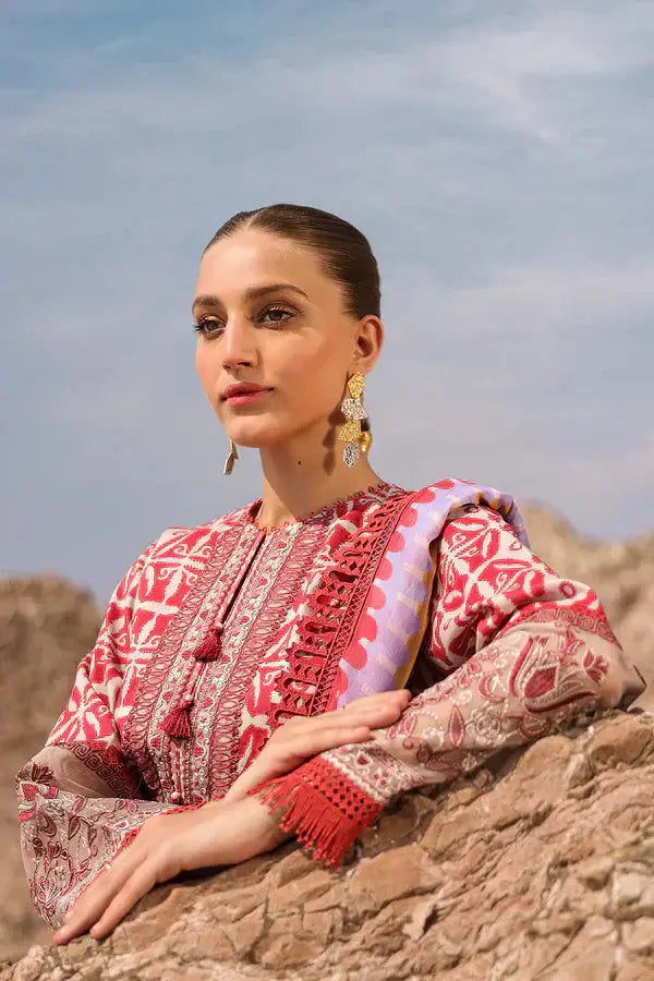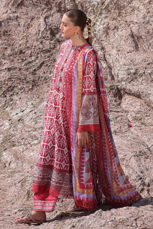A striking red outfit from Ayzel’s Tropicana Lawn 24 Collection, featuring a digitally printed lawn shirt enhanced with an organza embroidered neckline patch, front border, and sleeves border. The ensemble is paired with a chiffon digital printed dupatta and a cotton printed trouser, creating a vibrant and elegant look perfect for semi-formal and festive occasions.