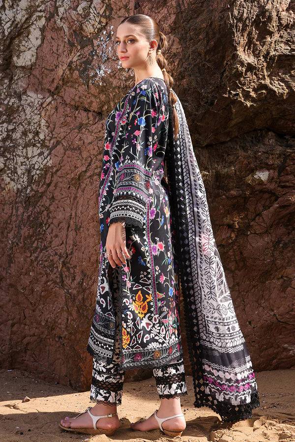A chic black outfit from Ayzel’s Tropicana Lawn 24 Collection, featuring a digitally printed lawn shirt enhanced with an organza embroidered neckline patch and combined sleeves + front border. Paired with a silk digital printed dupatta and a cotton printed trouser, this ensemble offers a polished and elegant look perfect for semi-formal and festive occasions.
