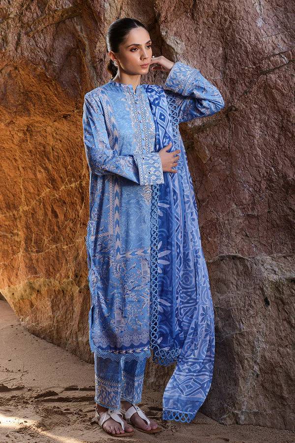 A vibrant blue outfit from Ayzel’s Tropicana Lawn 24 Collection, featuring a digitally printed lawn shirt with an organza embroidered neckline patch and detailed sleeves + trouser border. Completed with a chiffon digital printed dupatta and a cotton printed trouser, this ensemble combines elegance with comfort, perfect for semi-formal gatherings and festive occasions.