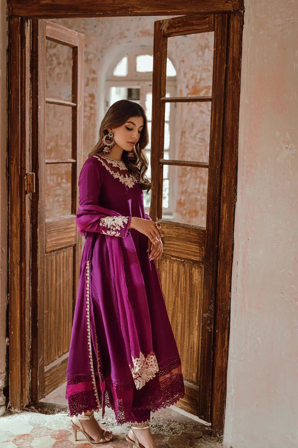 Look sophisticated in this burgundy ensemble 'Imperial Plum', a side slit open frock crafted from raw silk and enhanced with a hand-embellished neckline and sleeves of sequins, pearls, and organza laces on the border. It's paired with straight raw silk pants ornamented with embroidered lace on the hemline and an embroidered pure organza dupatta, offering you a complete ensemble for any special event.